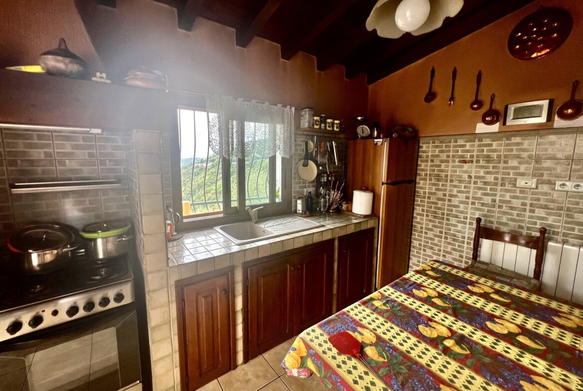 Die Gebäude wurden im Jahr 2000 aus den Überresten zweier traditioneller Natursteinhäuser komplett neu aufgebaut. Das Haupthaus hat rund 75 qm Wohnfläche und ist von großzügigen Terrassen umgeben. Im Erdgeschoss empfängt der Haupteingang mit Diele, links schließen sich zwei ineinander übergehende Wohnräume und rechts das Duschbad und die Wohnküche an. Von der Küche gelangt man auf eine Terrasse mit einem geschützten Sitzplatz. Eine Wendeltreppe führt von der Diele in die obere Etage; hier ist das Schlafzimmer mit einer weiteren Sonnenterrasse untergebracht.