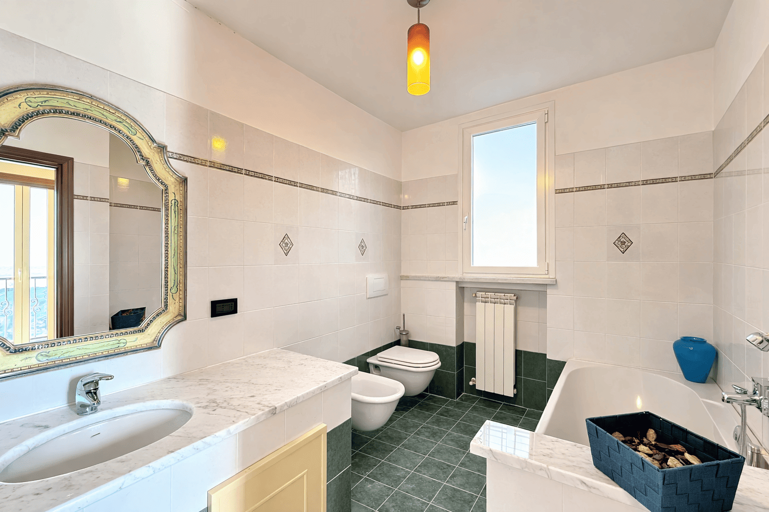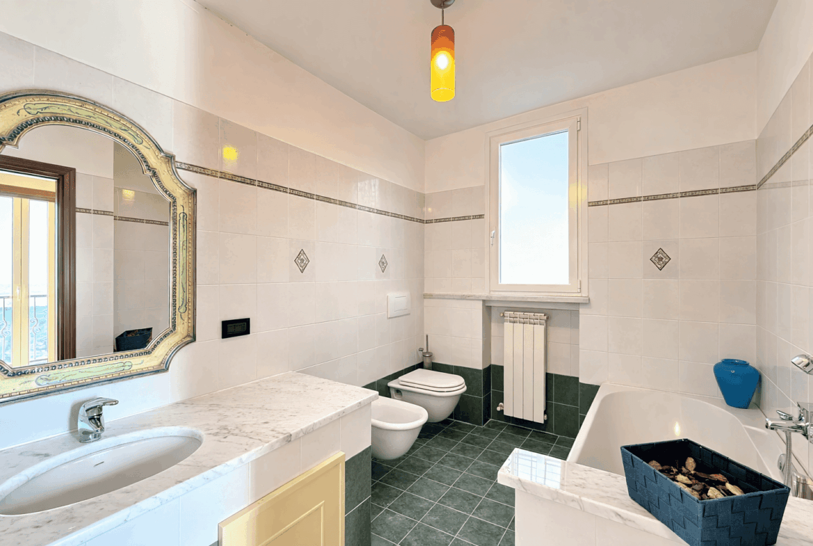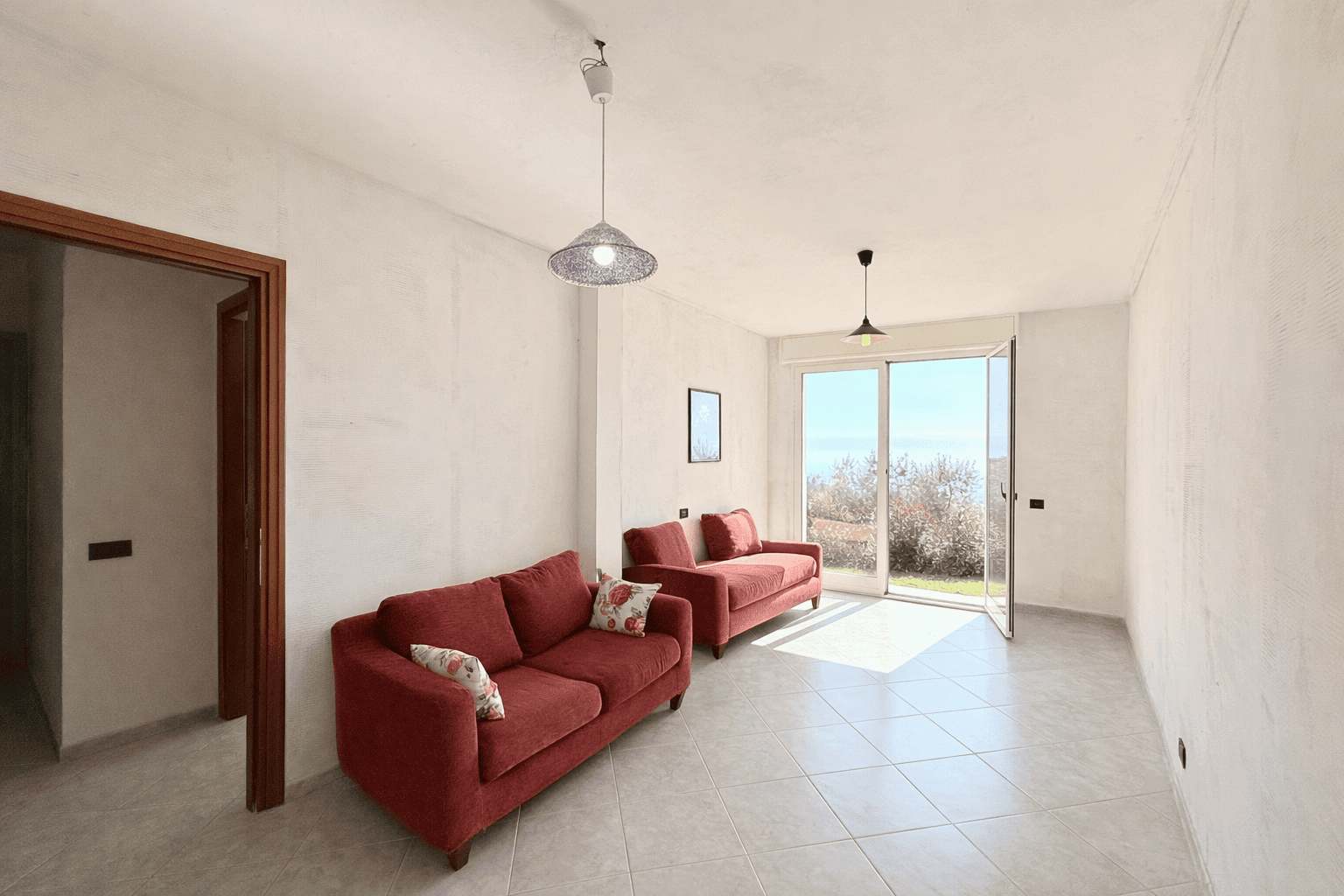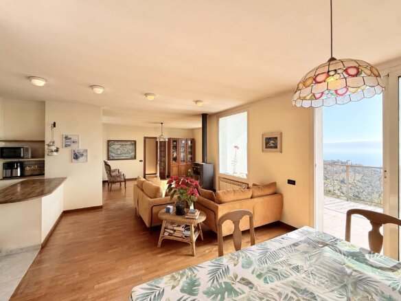 Architektonisch zeigt sich das Haus von außen im klassischen ligurischen Landhausstil, während im Inneren ein großzügiger und gut durchdachter Grundriss überzeugt. Bereits beim Betreten öffnet sich der Blick in den weitläufigen, lichtdurchfluteten Wohnbereich mit offener Küche und Essplatz, der sich über rund 50 m² erstreckt. Großzügige Panoramafenster fassen den spektakulären Blick auf das Meer und Porto Maurizio wie ein Bild ein und lassen viel Tageslicht in den Raum. Eine Fenstertür führt direkt auf die umlaufende Terrasse sowie in den gepflegten Garten – ein wunderbarer Ort, um das mediterrane Klima, die Ruhe der Umgebung und den weiten Blick auf die Küste zu genießen. Auf dieser Ebene befinden sich darüber hinaus ein Arbeits- oder Gästezimmer sowie ein Badezimmer.