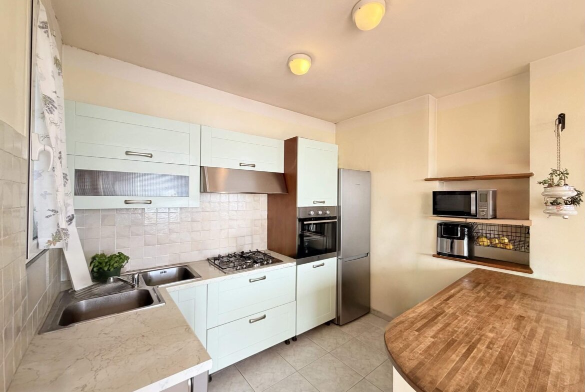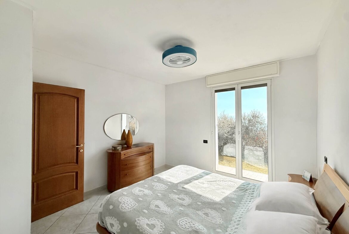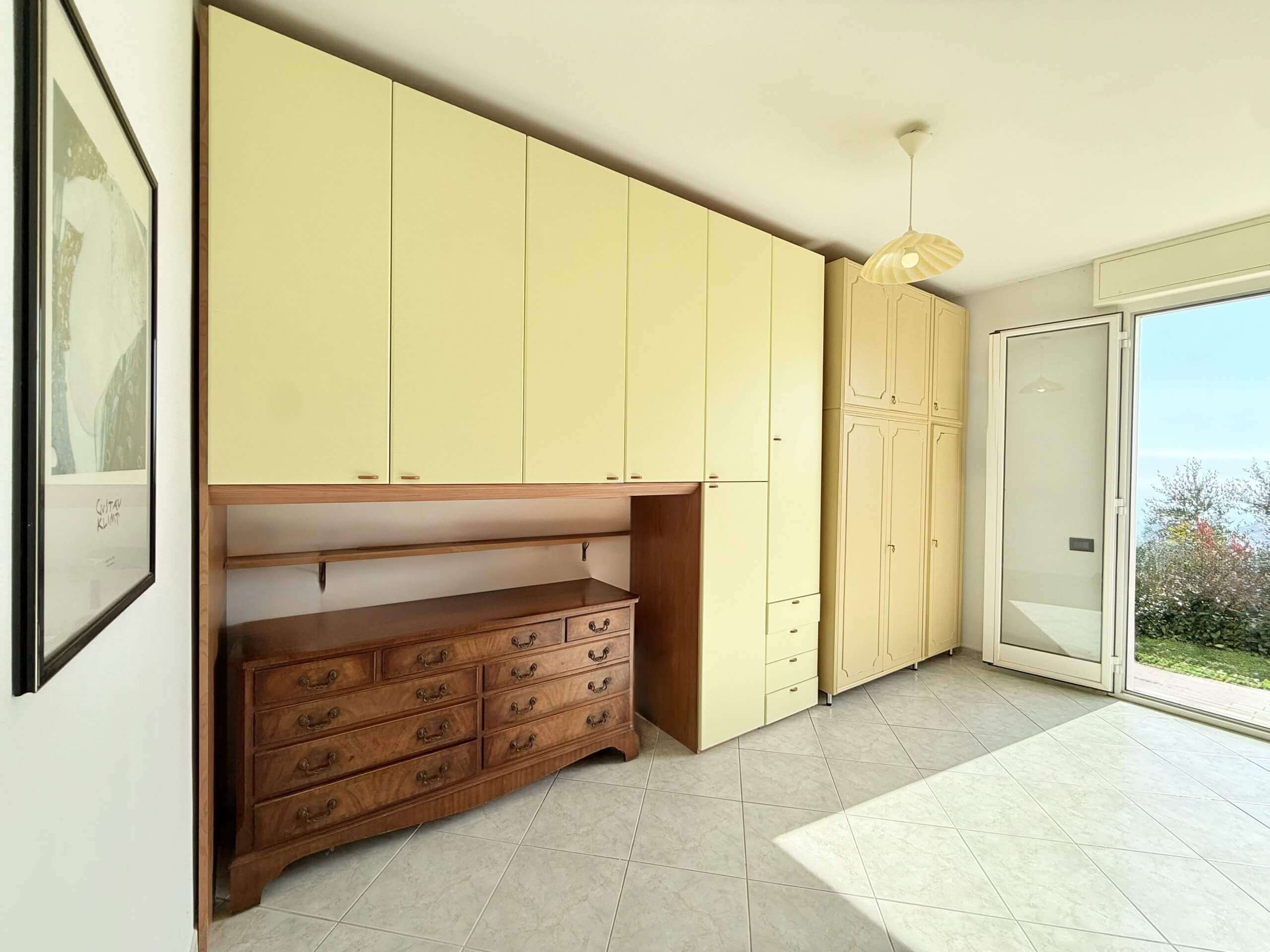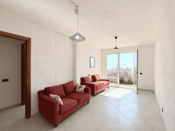 Architektonisch zeigt sich das Haus von außen im klassischen ligurischen Landhausstil, während im Inneren ein großzügiger und gut durchdachter Grundriss überzeugt. Bereits beim Betreten öffnet sich der Blick in den weitläufigen, lichtdurchfluteten Wohnbereich mit offener Küche und Essplatz, der sich über rund 50 m² erstreckt. Großzügige Panoramafenster fassen den spektakulären Blick auf das Meer und Porto Maurizio wie ein Bild ein und lassen viel Tageslicht in den Raum. Eine Fenstertür führt direkt auf die umlaufende Terrasse sowie in den gepflegten Garten – ein wunderbarer Ort, um das mediterrane Klima, die Ruhe der Umgebung und den weiten Blick auf die Küste zu genießen. Auf dieser Ebene befinden sich darüber hinaus ein Arbeits- oder Gästezimmer sowie ein Badezimmer.