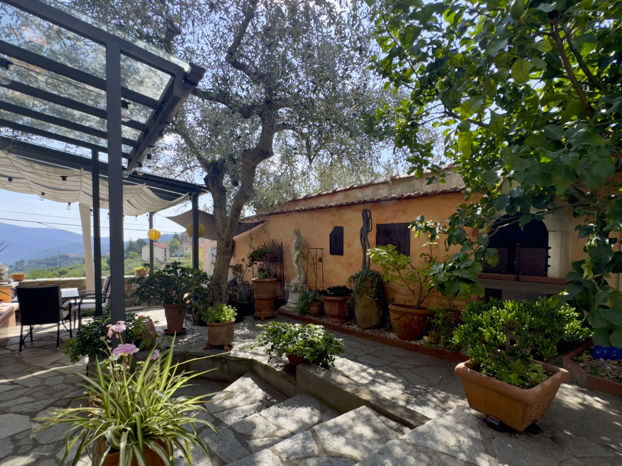 Die nach Süden liegende circa 65 m2 große Gartenterrasse mit windgeschütztem, überdachten Sitzplatz ist der perfekte Ort zum Entspannen und Essen im Freien, auch in der kühleren Jahreszeit. Genießen Sie dabei den wunderschönem Ausblick über das Tal und die gegenüberliegenden Höhenzüge. Der Oliven- als auch der Zitronen- und Kumquatbaum tragen jedes Jahr reichlich Früchte.