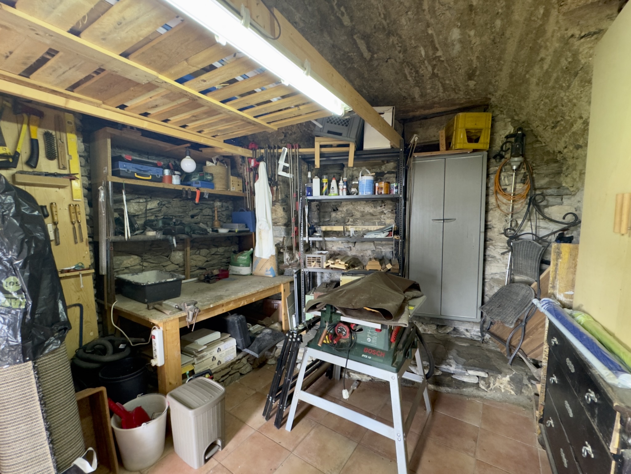 Ein Gewölbekeller von 18 m2 im Nachbarhaus ist ideal als Werkstatt oder Atelier, ein Holzgartenhaus (ca. 5 m2) bietet zusätzlichen Stauraum.