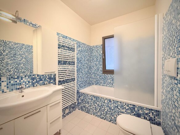 Das großzügige Schlafzimmer bietet ausreichend Platz für Ruhe und Rückzug, während das Badezimmer mit Badewanne angenehmen Komfort und entspannte Momente ermöglicht.