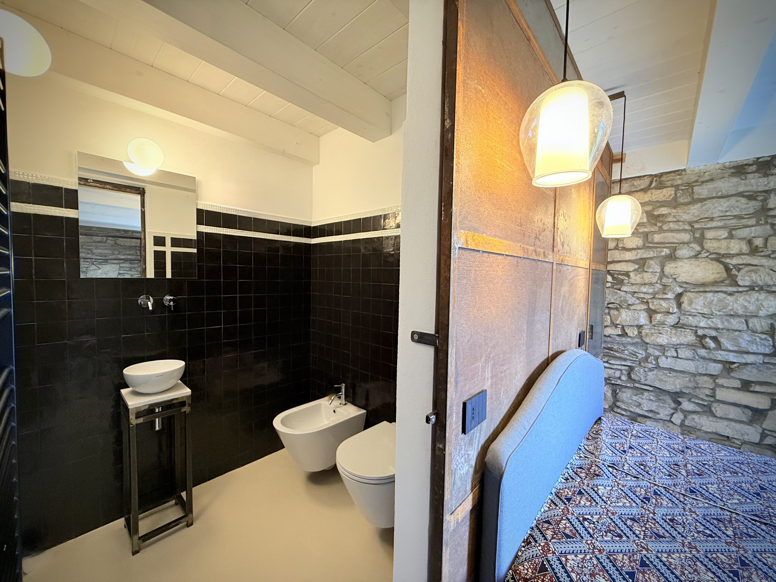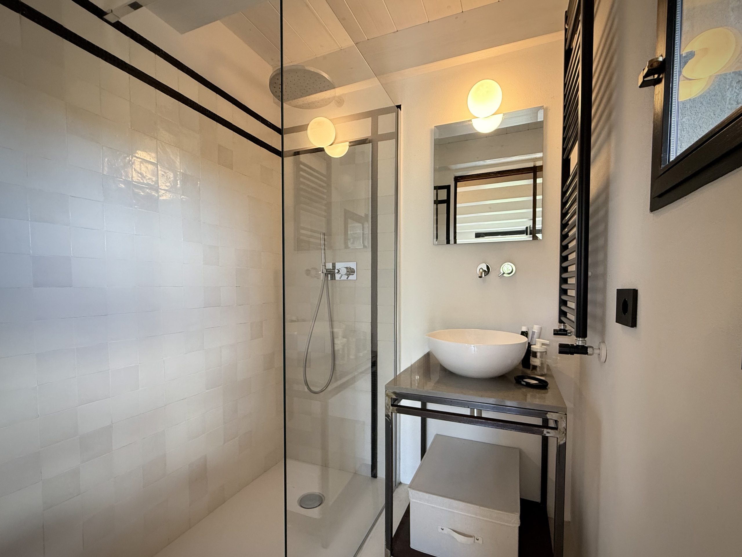 Links vom Eingangsbereich befindet sich ein stilvolles Doppelschlafzimmer (Bett 160 x 200 cm) sowie ein großzügiges Badezimmer mit direktem Zugang zu einer weiteren Terrasse. Im Erdgeschoss liegt ein kleines, separates Gästeappartement mit Schlafzimmer (Bett 140 x 200 cm), Duschbad und separater Toilette – ideal für Freunde oder Familie.