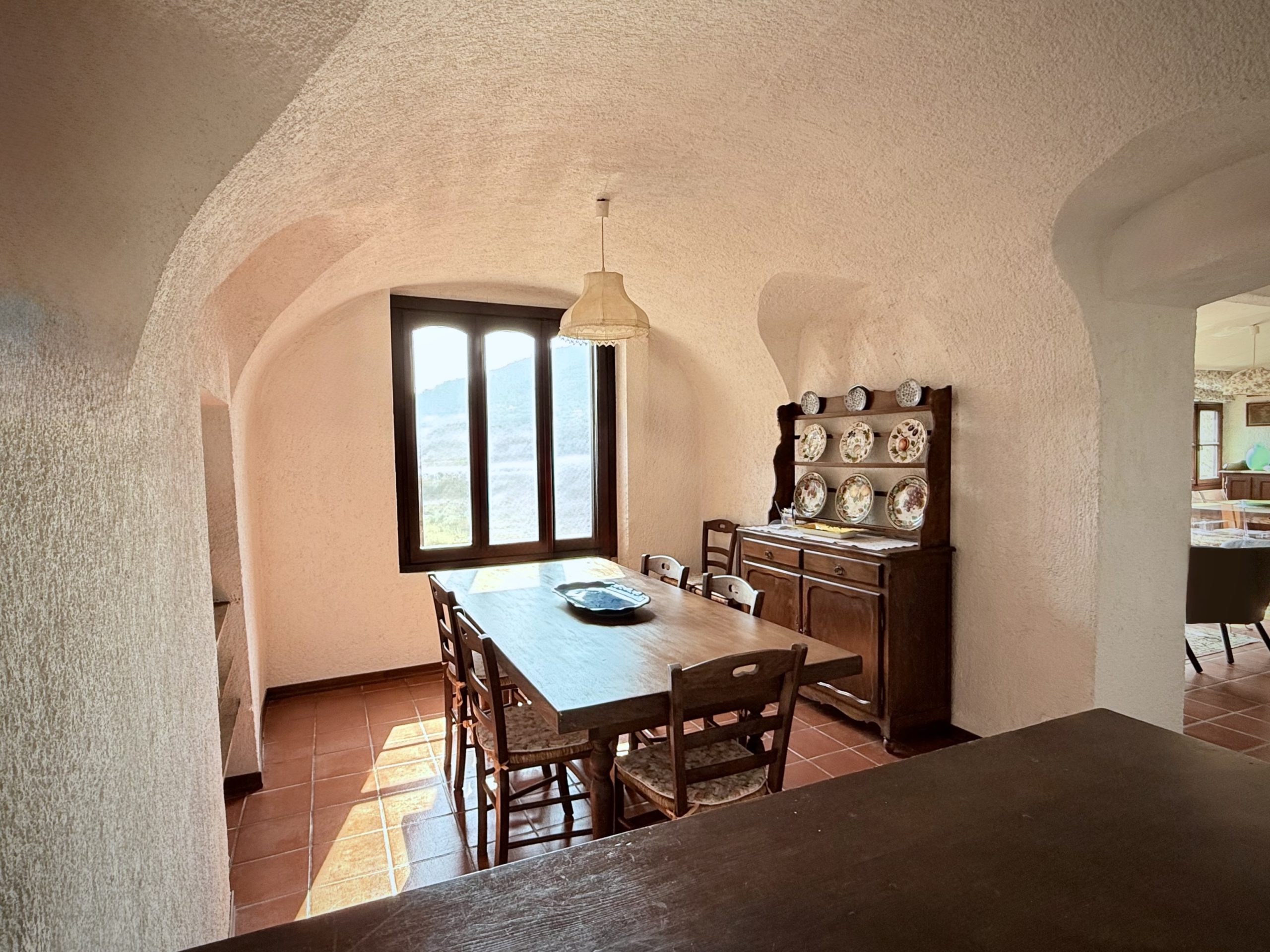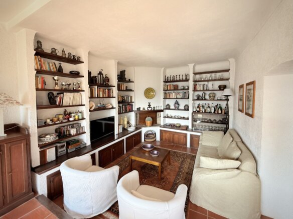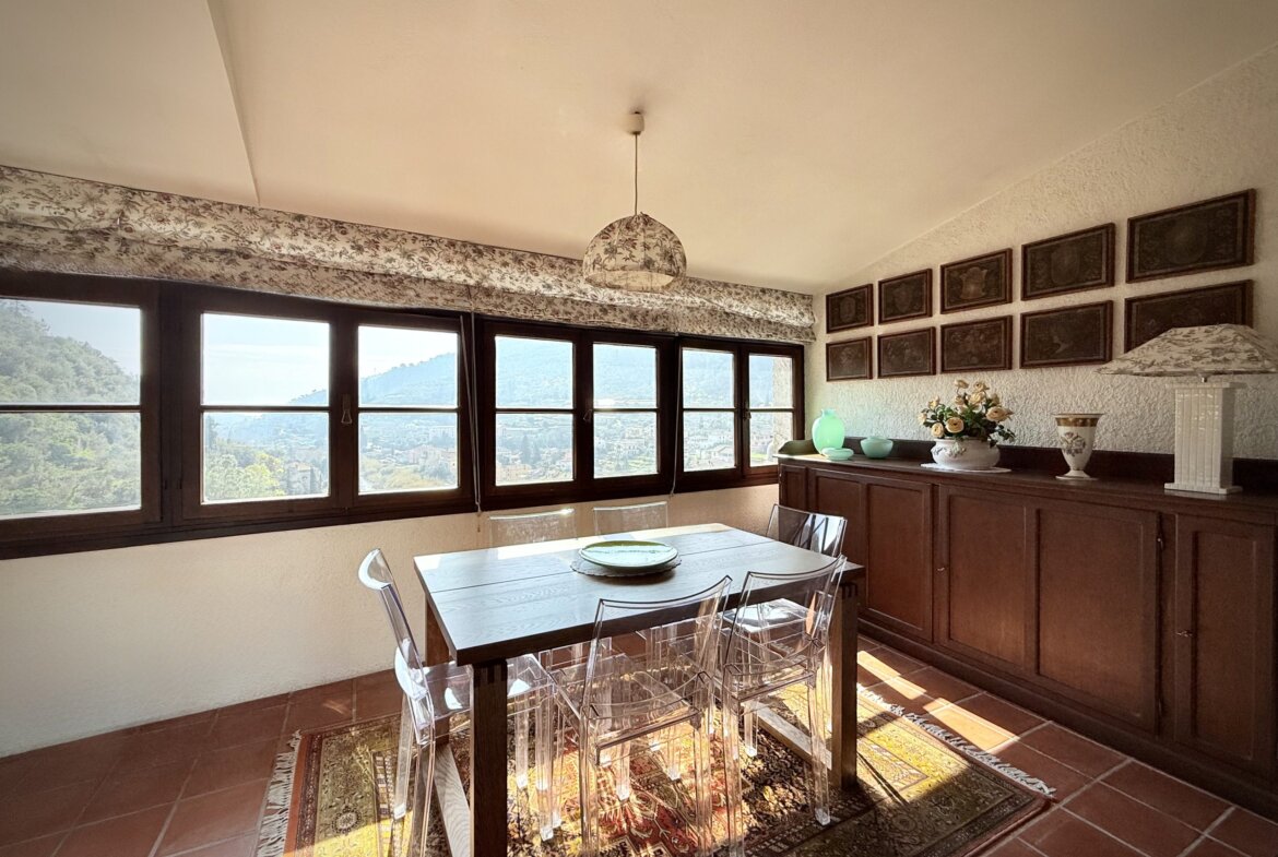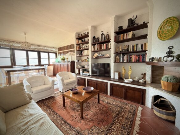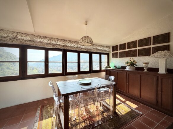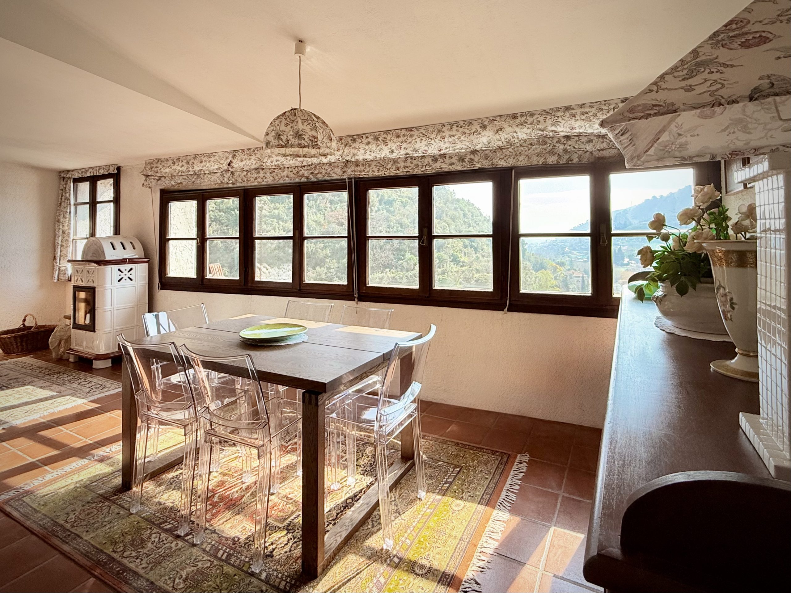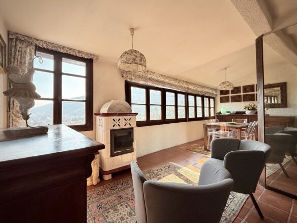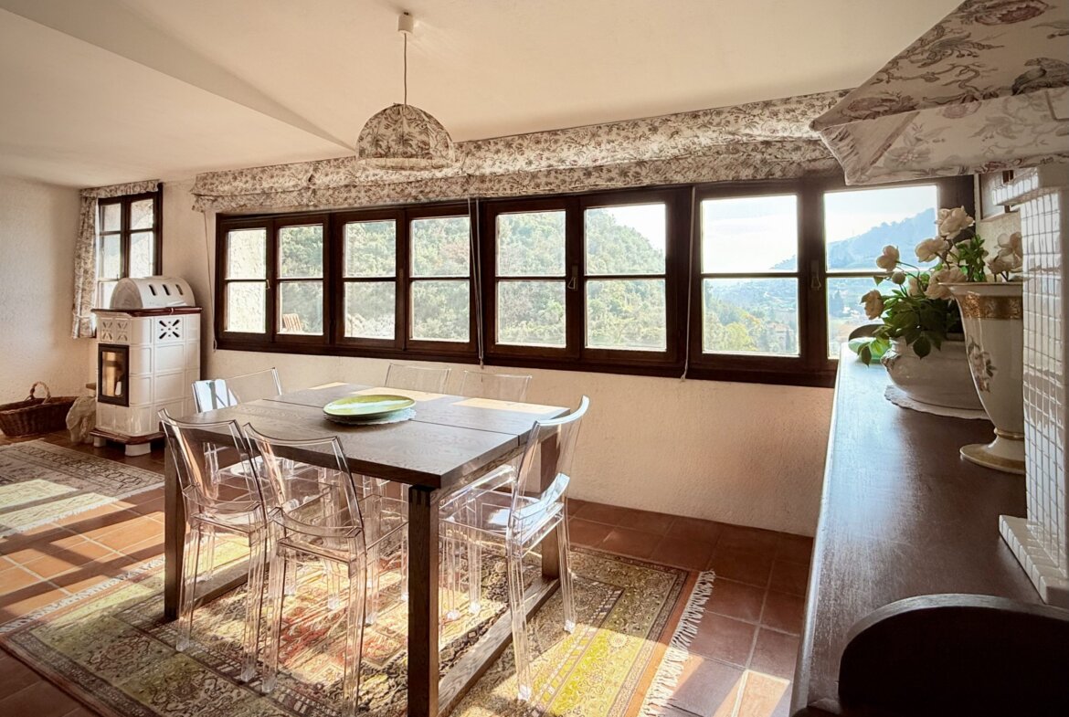 Die dritte Etage beherbergt den hellen und einladenden Wohnbereich mit offener Küche und Essbereich sowie einem weiteren Abstellraum. Der großzügige Wohnraum ist flexibel gestaltet und bietet verschiedene Zonen zum Entspannen und Genießen. Ob Sie ein Buch am Panoramafenster mit Blick auf Dolceacqua lesen, ein sonniges Frühstück genießen oder sich vor dem knisternden Holzkamin entspannen – hier finden Sie Ihren Lieblingsplatz. Ein Pelletofen bietet eine weitere Heizoption.