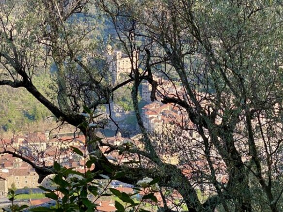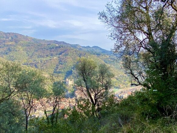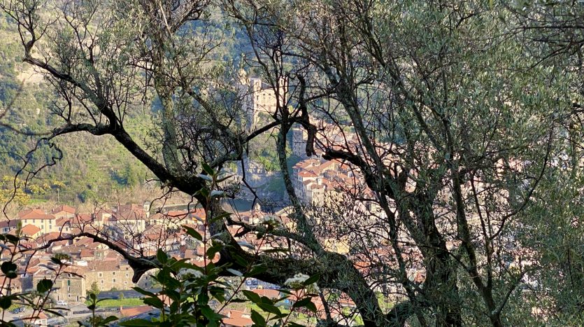 Olivenhain mit Rustico und Blick auf Dolceacqua