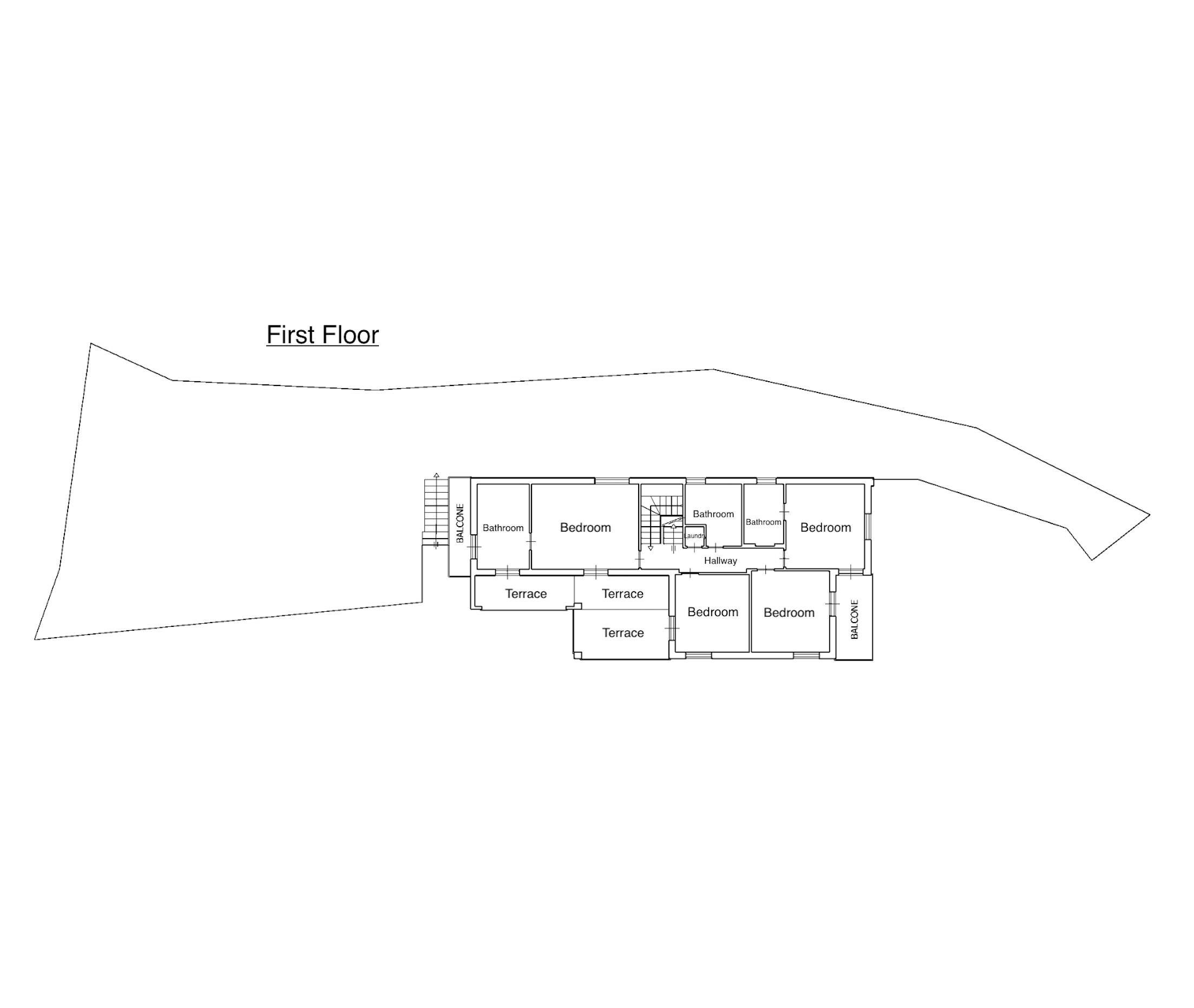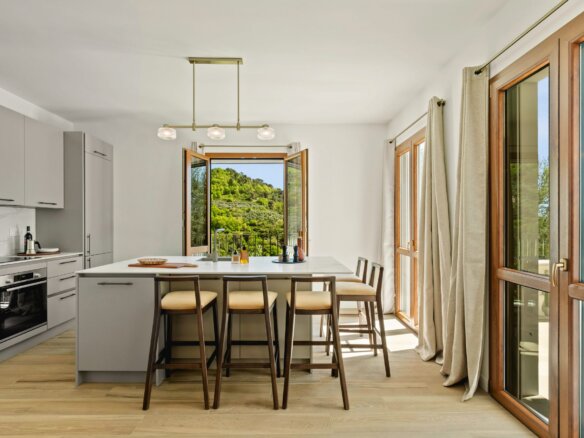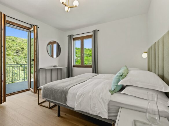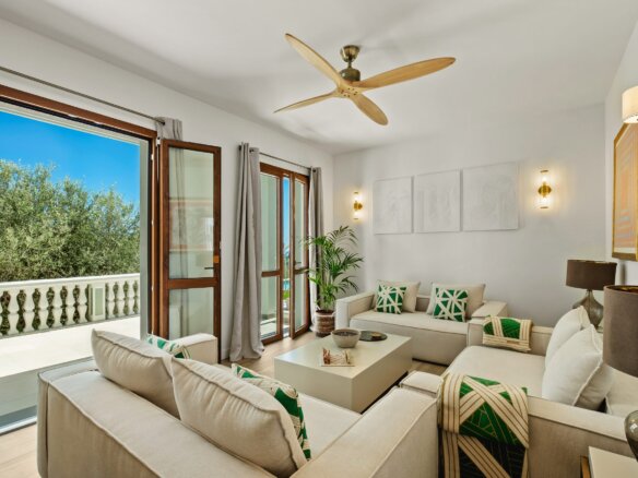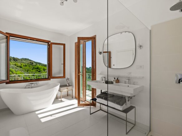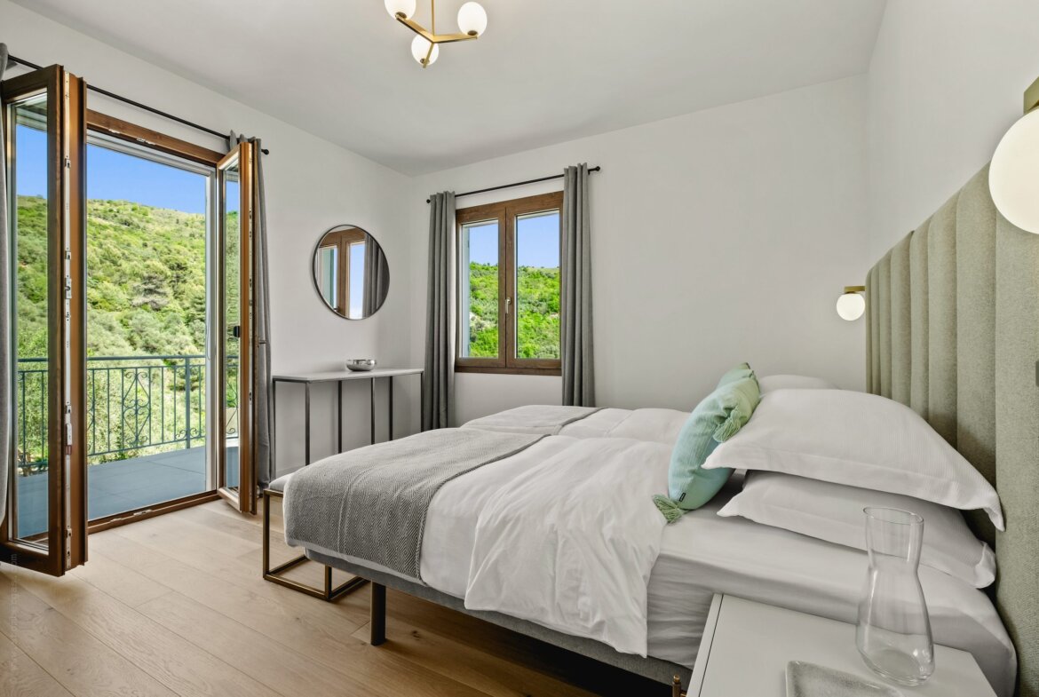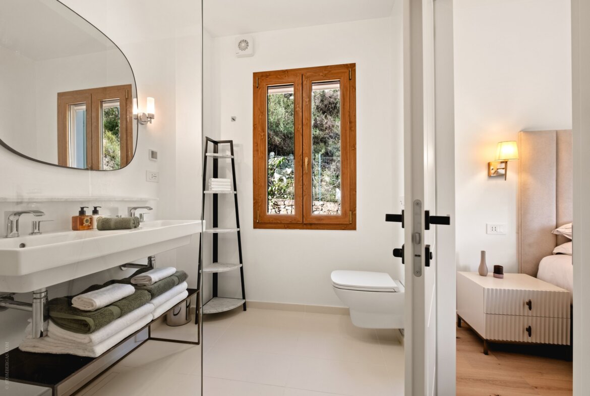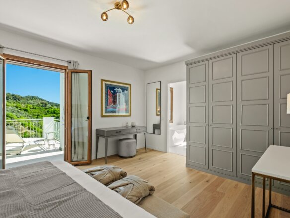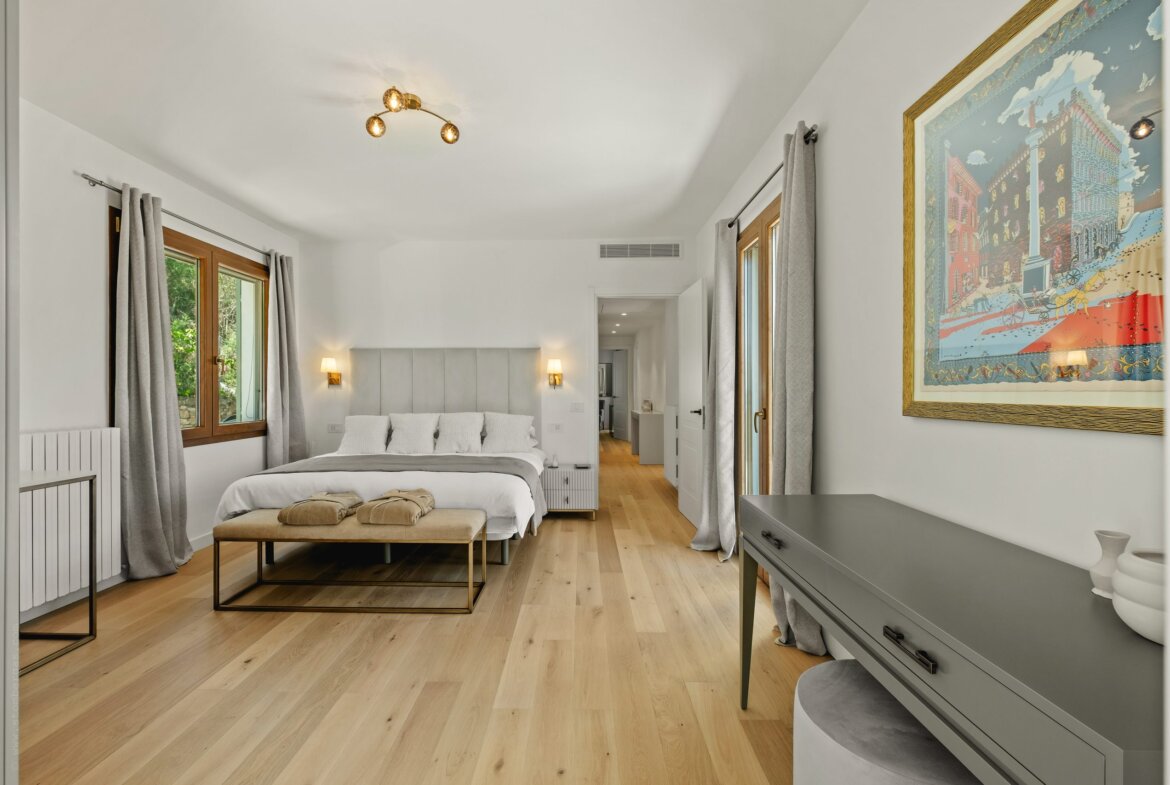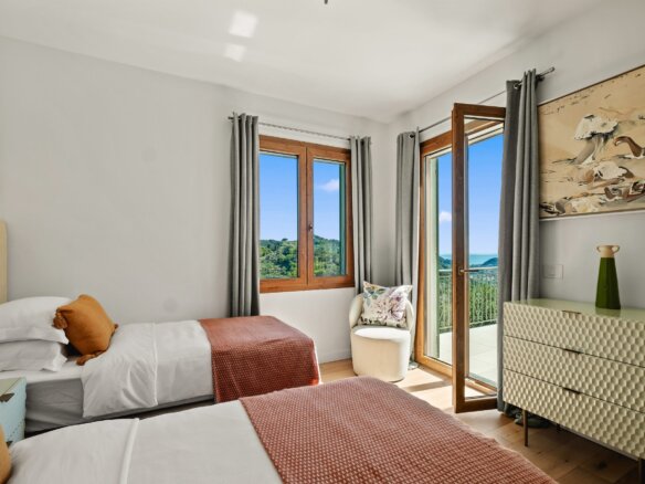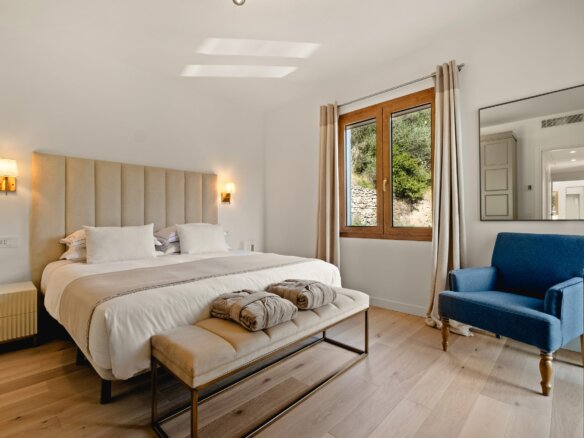 Im Obergeschoss befinden sich vier stilvoll gestaltete Schlafzimmer sowie drei moderne Bäder. Das lichtdurchflutete Hauptschlafzimmer mit Blick auf das Meer verfügt über ein luxuriöses Bad mit freistehender Wanne, Walk-In-Dusche und direkten Zugang zum Poolbereich. Ein weiteres Doppelzimmer mit eigenem Bad, zwei Einzelzimmer, mit jeweils zwei Betten, mit gemeinsamem Duschbad sowie eine separate Waschküche komplettieren das Raumangebot. Alle Zimmer verfügen über einen eigenen Zugang zu Balkon oder Terrasse – ideal, um die herrliche Umgebung auch im privaten Rückzugsbereich zu genießen.