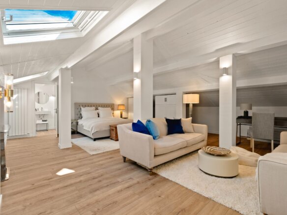 Das Dachgeschoss ist als großzügiger Open Space gestaltet und aktuell in Wohn- und Arbeitsbereich sowie zwei offene Schlafzonen mit separatem Duschbad unterteilt. Dieser Bereich eignet sich flexibel als Gästeetage, Fitnessraum, Atelier oder Hobbybereich – Ihrer Kreativität sind keine Grenzen gesetzt.