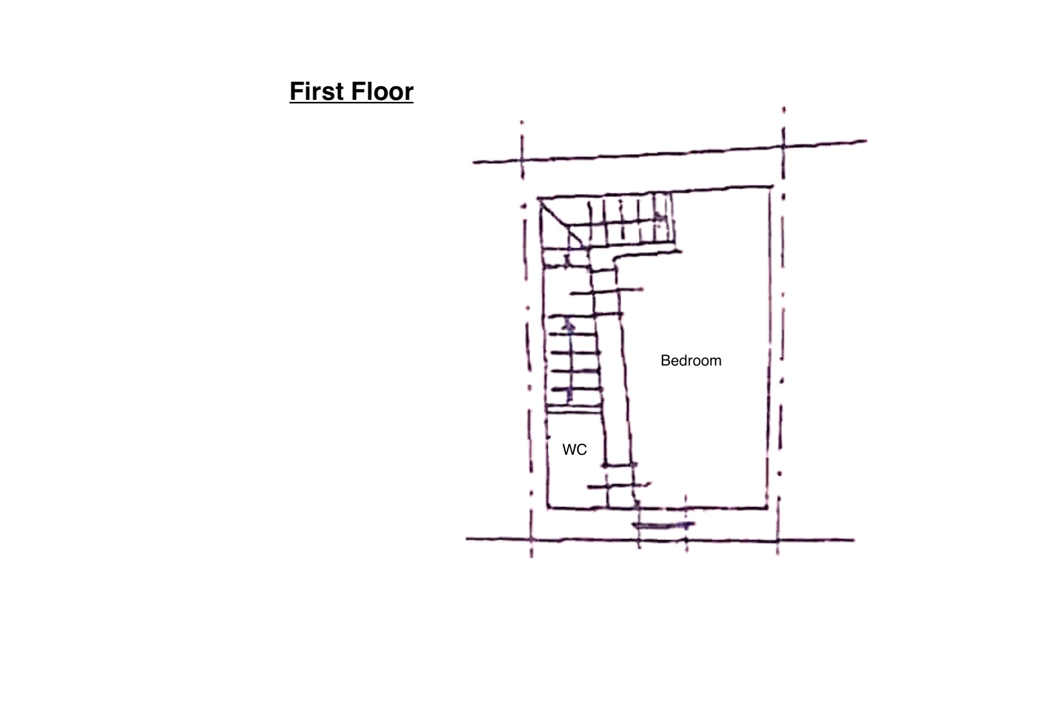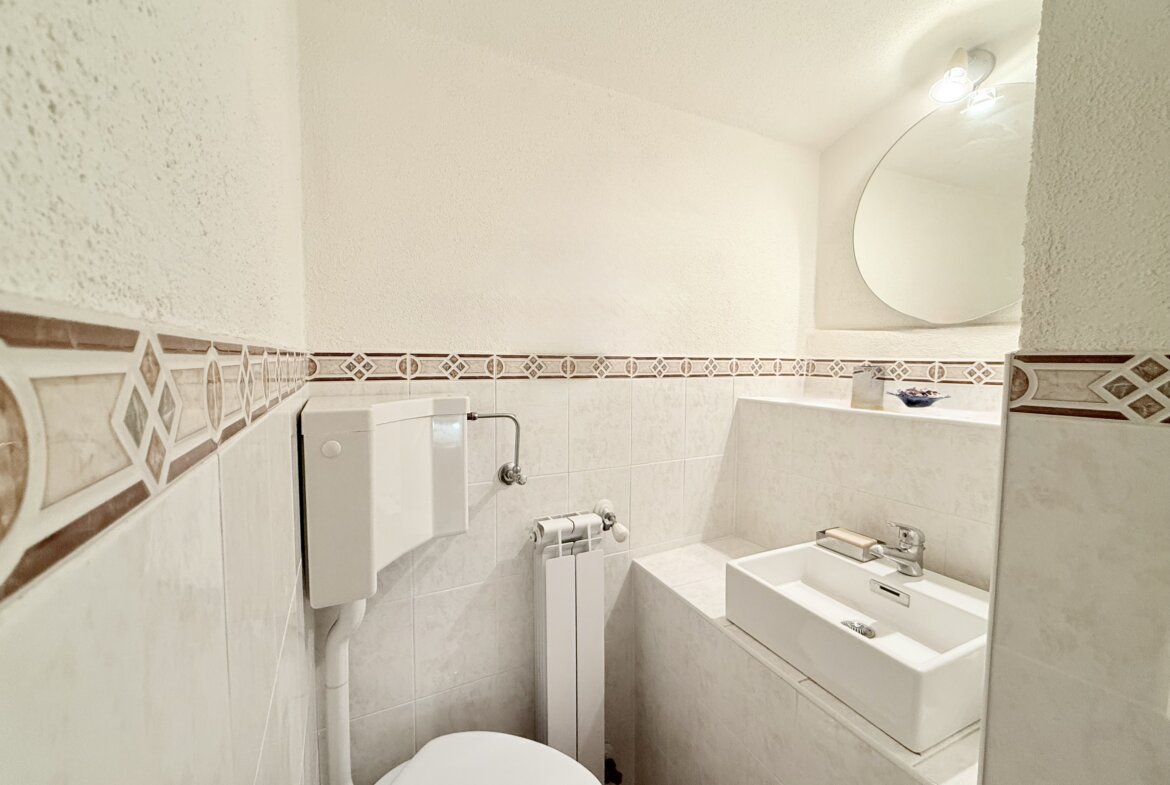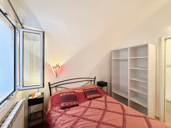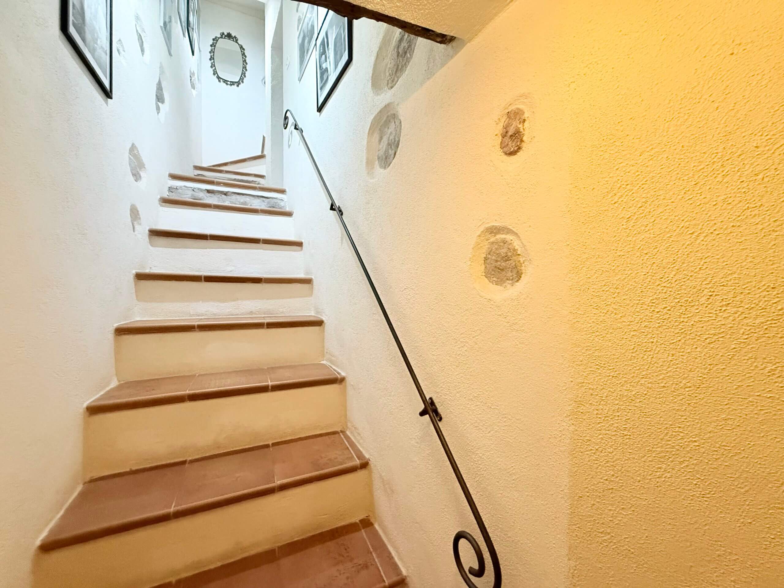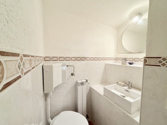 Vom Eingangsbereich aus gelangen Sie über eine Treppe in das erste Obergeschoss, wo Sie ein großzügiges Schlafzimmer mit charakteristischen Rundbögen erwartet. Ein praktisches en-suite-WC ergänzt diese Ebene. Im darüberliegenden Geschoss befinden sich ein weiteres gemütliches Schlafzimmer sowie ein geräumiges, geschmackvoll ausgestattetes Duschbad.