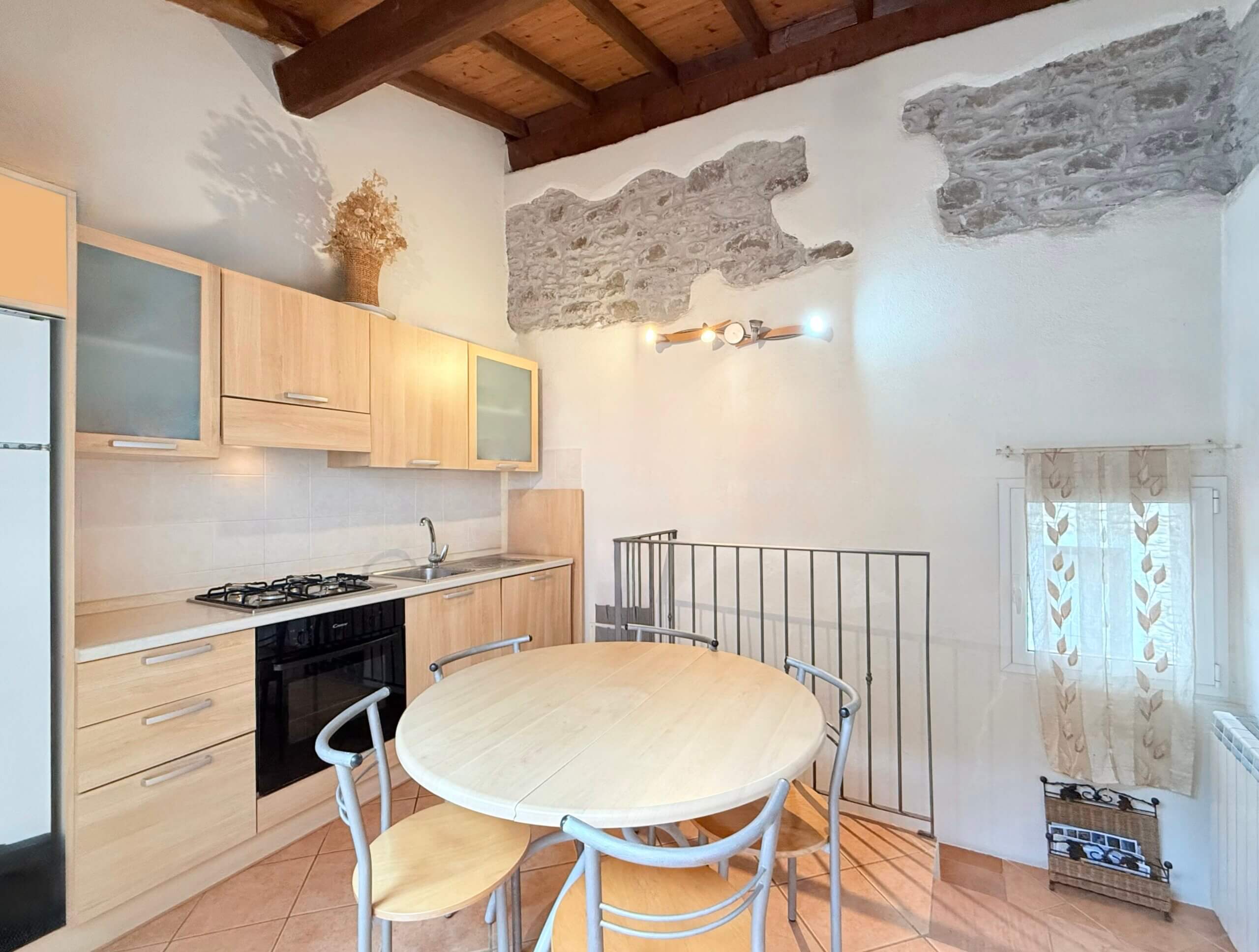 Das Herzstück des Hauses liegt im obersten Stockwerk: Hier befindet sich eine helle, offene Wohnküche mit besonderem Wohlfühlcharakter. Große Glasschiebetüren öffnen sich zur angrenzenden, ca. 8 m² großen Terrasse und schaffen einen fließenden Übergang zwischen Innen- und Außenbereich. Dieser geschützte, romantische Freisitz bietet ein hohes Maß an Privatsphäre und lädt dazu ein, sonnige Tage und laue Abende in mediterraner Atmosphäre zu genießen – sei es bei einem entspannten Frühstück oder einem geselligen Abend mit Freunden. Zur Ausstattung zählen klassische Holzfenster mit Doppelverglasung sowie ein Anschluss an das zentrale Gasnetz. Die Beheizung erfolgt über eine Gaszentralheizung.
