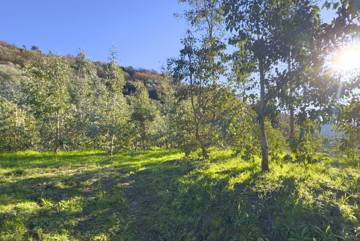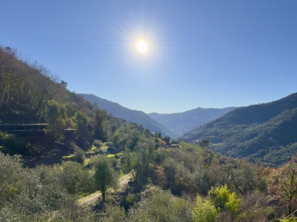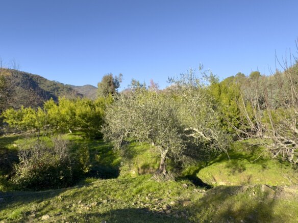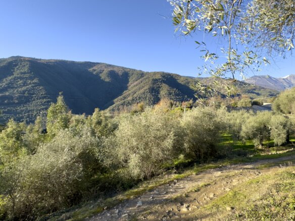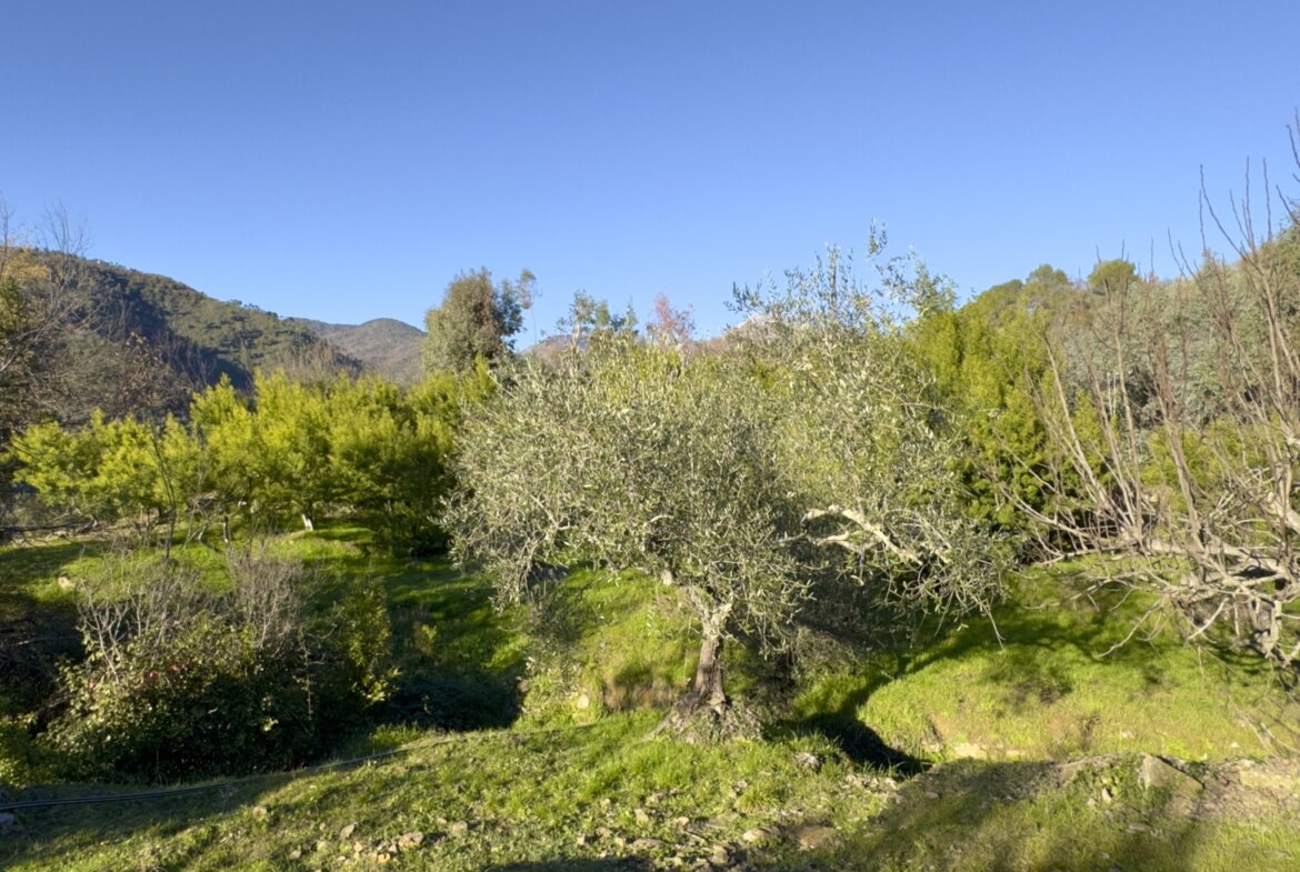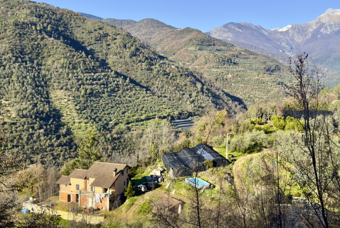 Das Anwesen liegt ruhig und umgeben von wunderbarer Natur an einem geschützten Süd-West-Hang zwischen Apricale und Isolabona. Von dieser einzigartigen Position genießt man einen traumhaft schönen Blick auf die umliegenden Hügel und den imposanten Monte Toraggio, der sich mit 1.971 m oberhalb des Val Nervia erhebt. Das ca. 2,8 ha große Grundstück ist ein Paradies für Naturliebhaber, es ist terrassiert und hat sehr viele eben Flächen, die als Olivenhain (ca. 85 Olivenbäume der Sorte Taggiasca), Obst- und Gemüsegarten sowie als Gärtnerei (u.a. mit Mimosen, Ruscus, Populus, etc.) bewirtschaftet werden. Das aufgestellte Schwimmbecken ist der ideale Platz für eine Erfrischung an heißen Sommertagen.