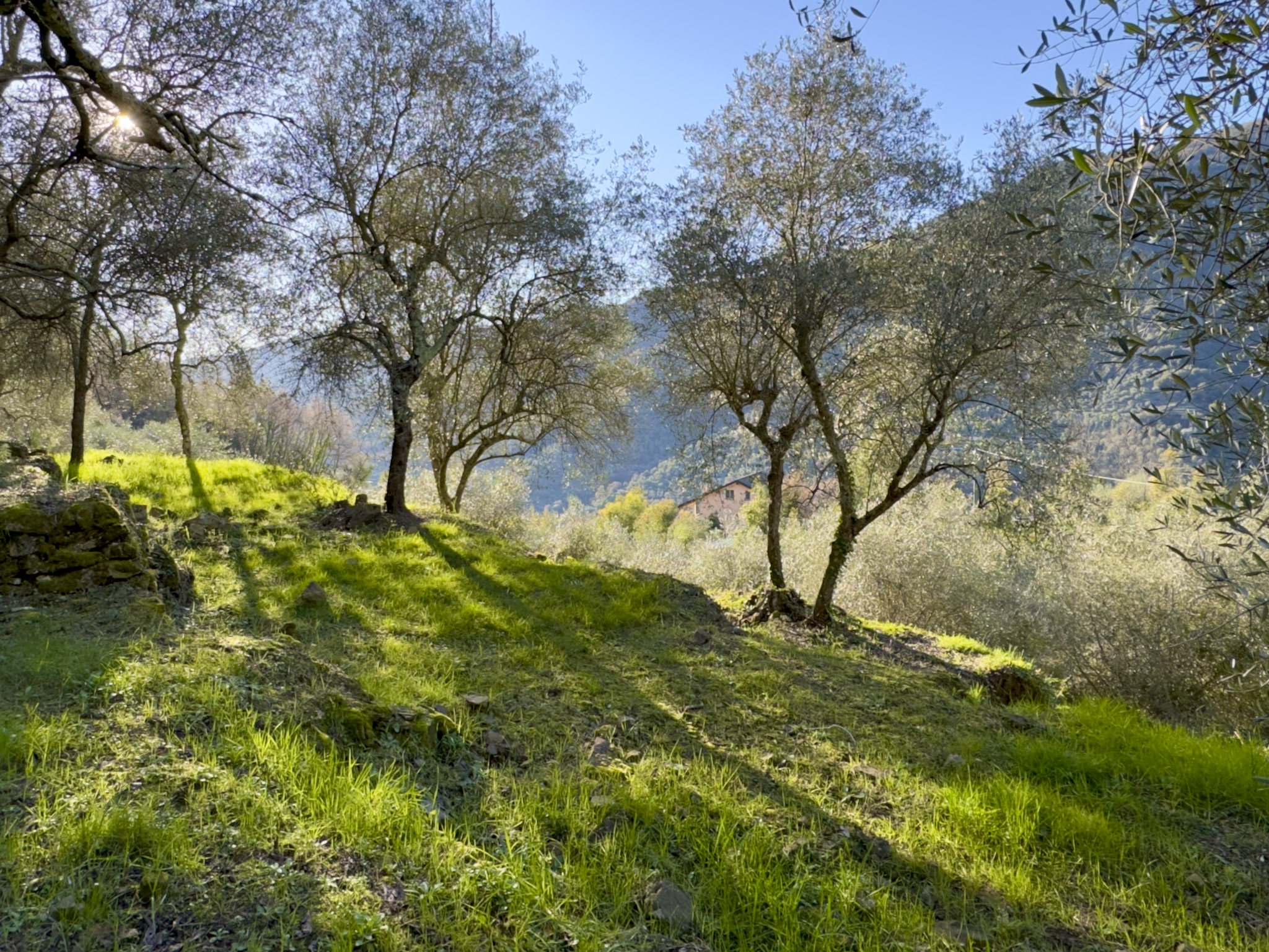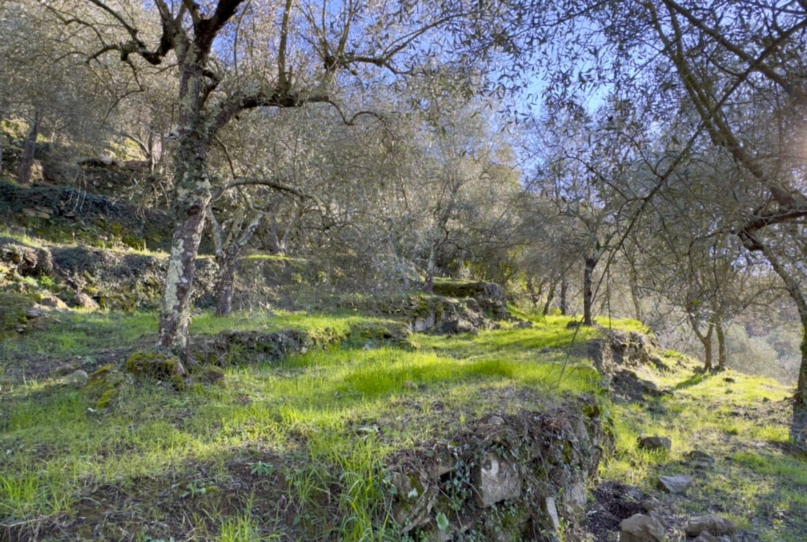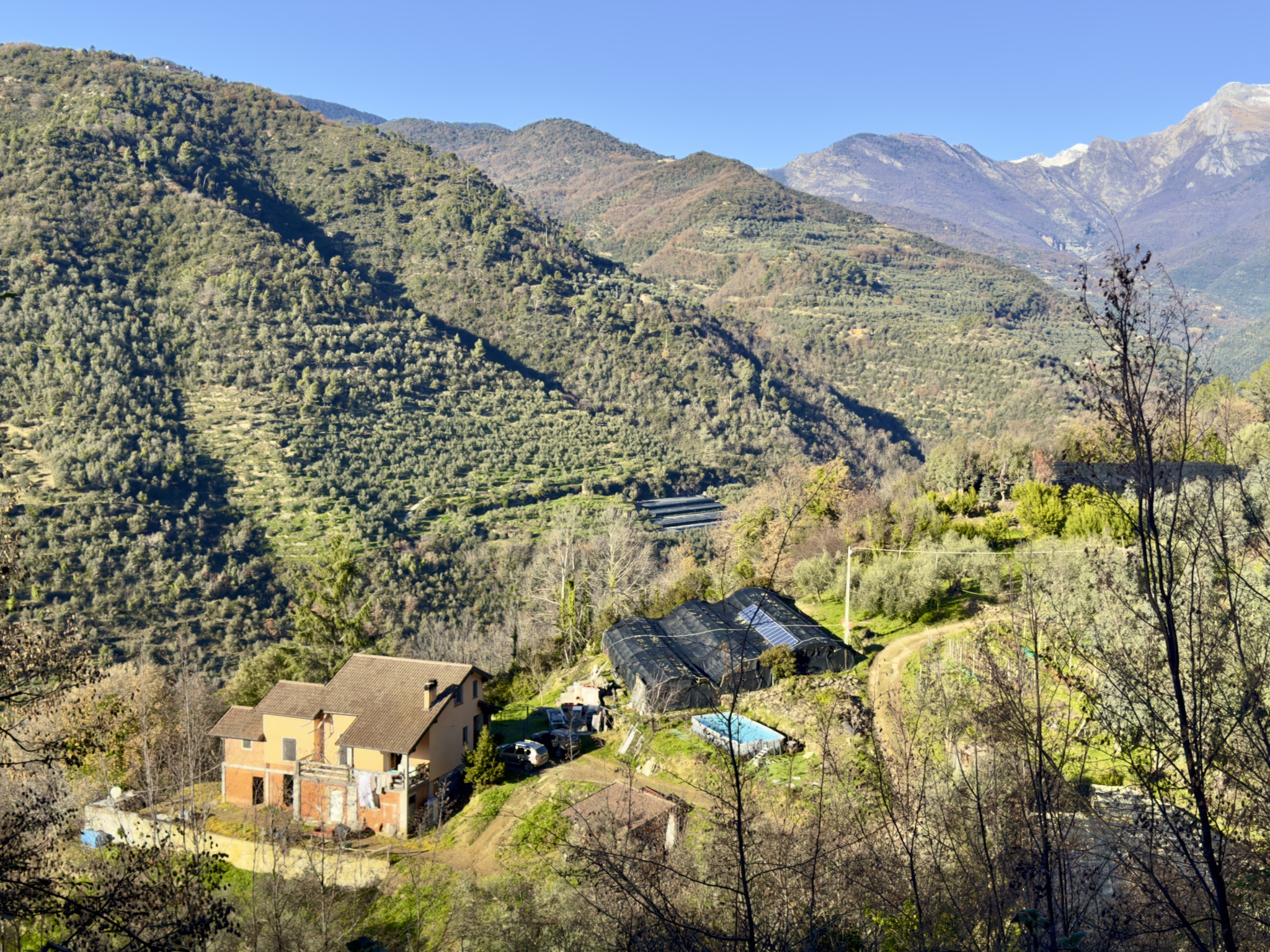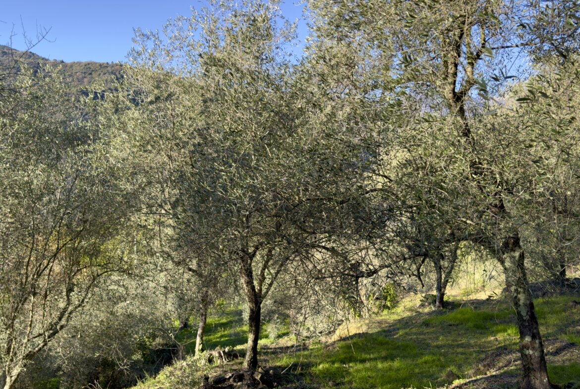 Das Anwesen liegt ruhig und umgeben von wunderbarer Natur an einem geschützten Süd-West-Hang zwischen Apricale und Isolabona. Von dieser einzigartigen Position genießt man einen traumhaft schönen Blick auf die umliegenden Hügel und den imposanten Monte Toraggio, der sich mit 1.971 m oberhalb des Val Nervia erhebt. Das ca. 2,8 ha große Grundstück ist ein Paradies für Naturliebhaber, es ist terrassiert und hat sehr viele eben Flächen, die als Olivenhain (ca. 85 Olivenbäume der Sorte Taggiasca), Obst- und Gemüsegarten sowie als Gärtnerei (u.a. mit Mimosen, Ruscus, Populus, etc.) bewirtschaftet werden. Das aufgestellte Schwimmbecken ist der ideale Platz für eine Erfrischung an heißen Sommertagen.