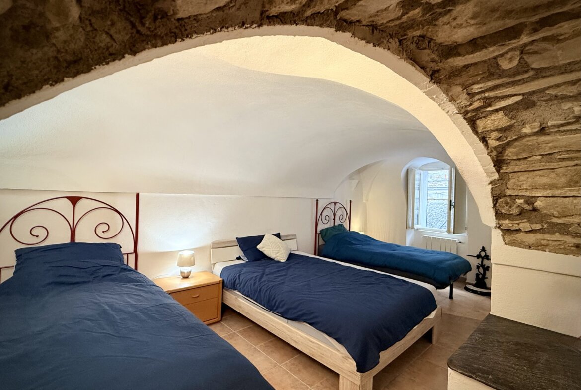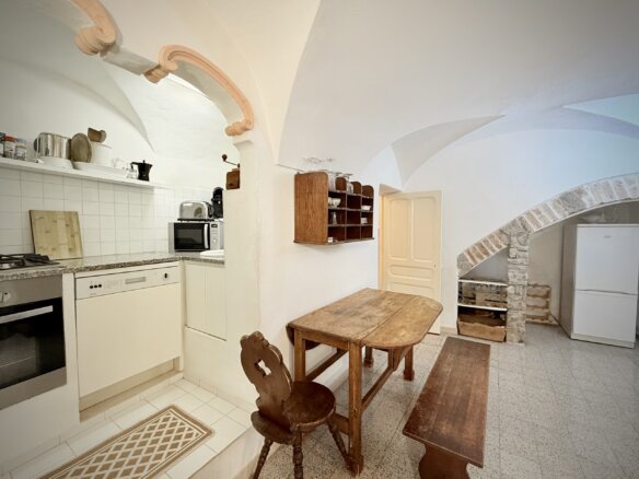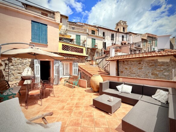 Dieses charmante Dorfhaus mit rund 80 m² Wohnfläche liegt idyllisch in den verwinkelten Gassen von Perinaldo. Die Räume erstrecken sich über drei Etagen und zeichnen sich durch typische ligurische Elemente wie Gewölbedecken und dekorative Wandnischen aus. Absolutes Highlight ist die rund 35 m² große, nach Süden ausgerichtete Panoramaterrasse: Von hier aus genießt man einen spektakulären Blick über die umliegende Hügellandschaft bis hin zum Meer. Sie bietet reichlich Platz zum Sonnenbaden, für Aperitifs bei Sonnenuntergang oder gesellige Essen im Freien.