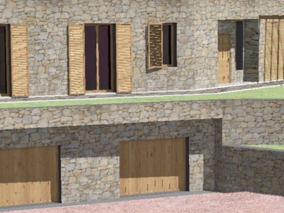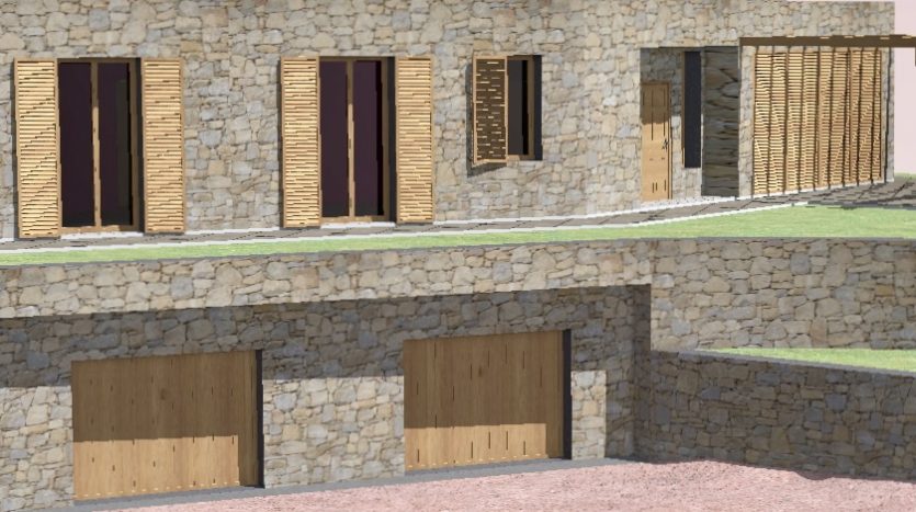 Fenstertüren in allen Räumen sowie ein großes Panoramafenster im Wohnbereich werden für ein lichtdurchflutetes Ambiente und einmalige Ausblicke sorgen. Rund um das Haus sind weitläufige Terrassen und Gartenanlagen geplant, eingebettet das Schwimmbad. Das Flachdach des natursteinverkleideten Hauses wird begrünt und ist ebenfalls Terrasse.