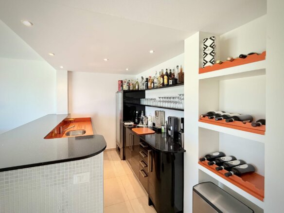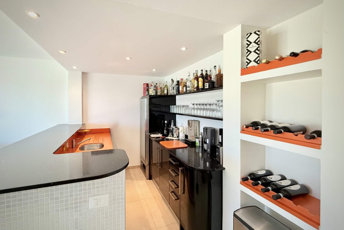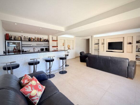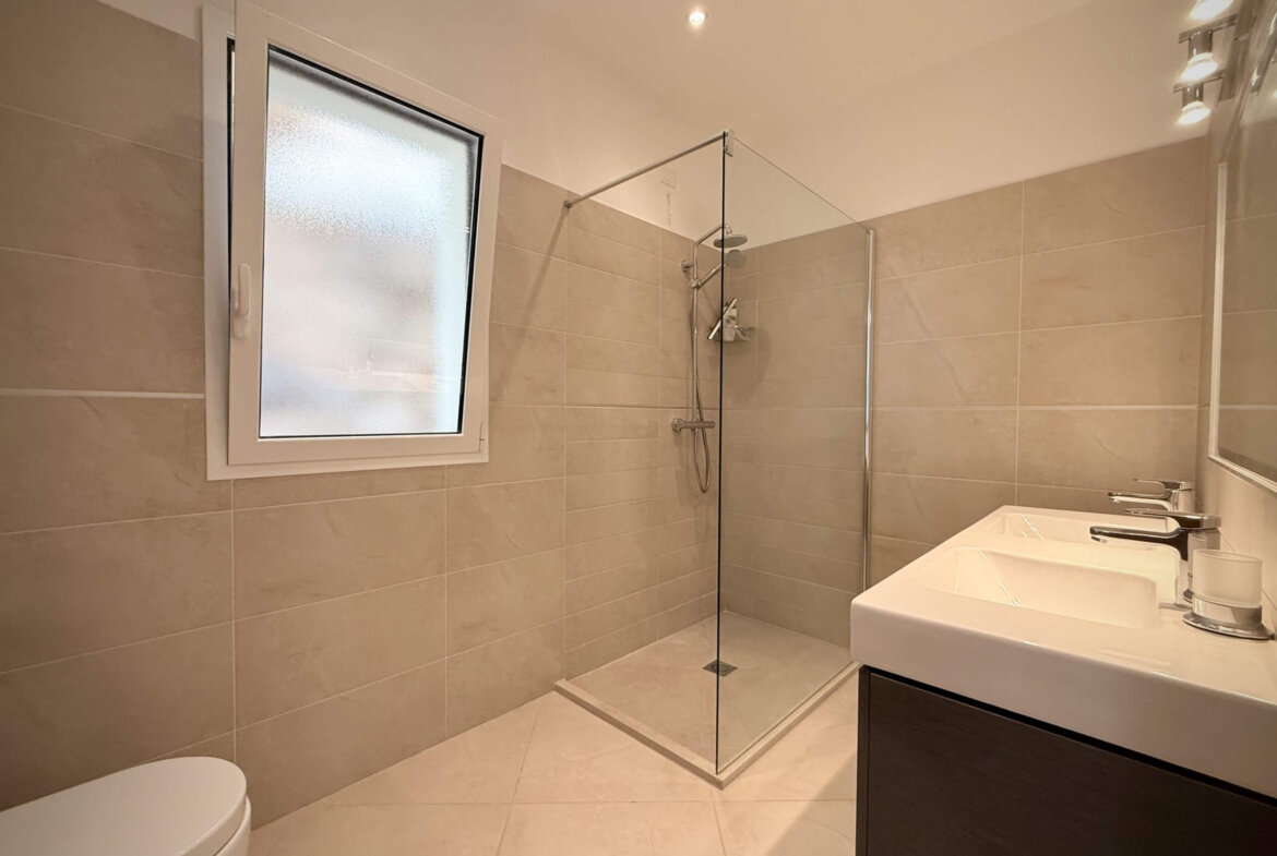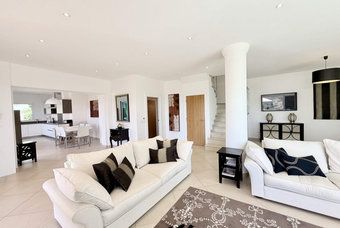 Im Erdgeschoss erwartet Sie ein weitläufiger Open-Space-Bereich, der Wohnzimmer, Essbereich und Küche harmonisch miteinander verbindet. Von hier aus öffnet sich die große Hauptterrasse – ein idealer Ort für Frühstück unter freiem Himmel oder stimmungsvolle Abendessen in mediterraner Atmosphäre. Ein Gäste-WC sowie ein separater Gästebereich mit Schlafzimmer, stilvollem Duschbad und kleinem Gartenrefugium ergänzen diese Wohnebene.