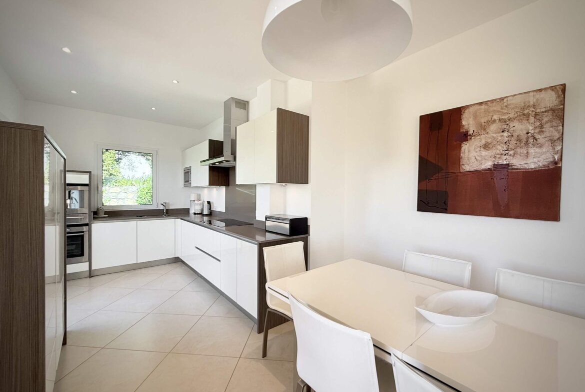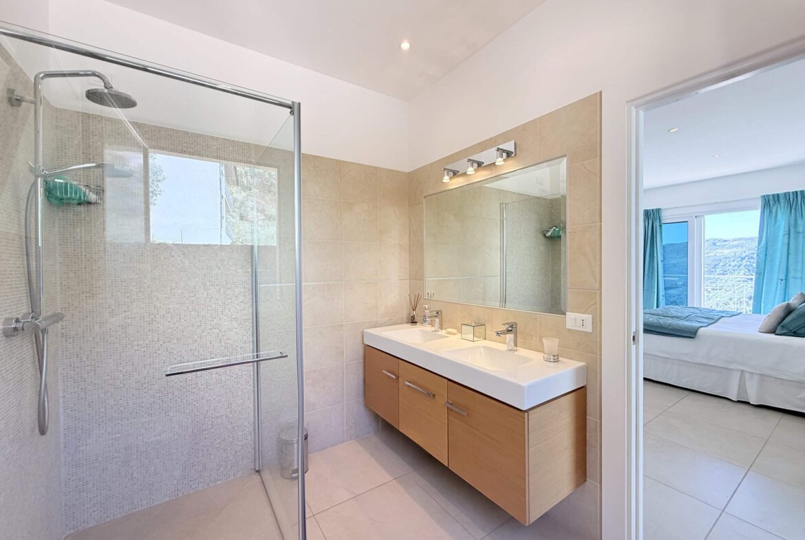 Das elegante Architekturkonzept besticht durch klare Linien, eine offene Raumgestaltung und ein modernes, helles Ambiente. Großflächige Schiebefenster mit Doppelverglasung und integrierter Sonnenschutzfolie schaffen ein angenehmes Raumklima und öffnen den Blick auf die ligurische Küste und das Grün der Umgebung.