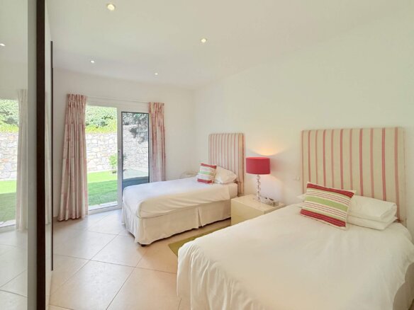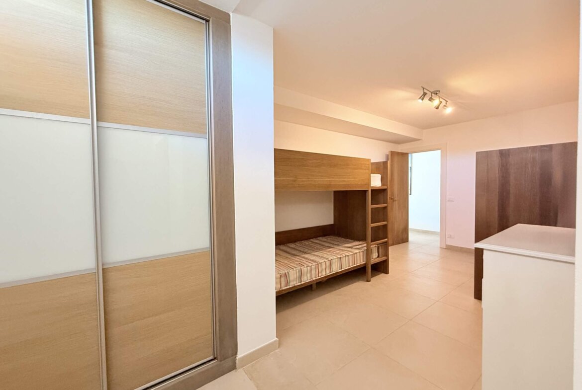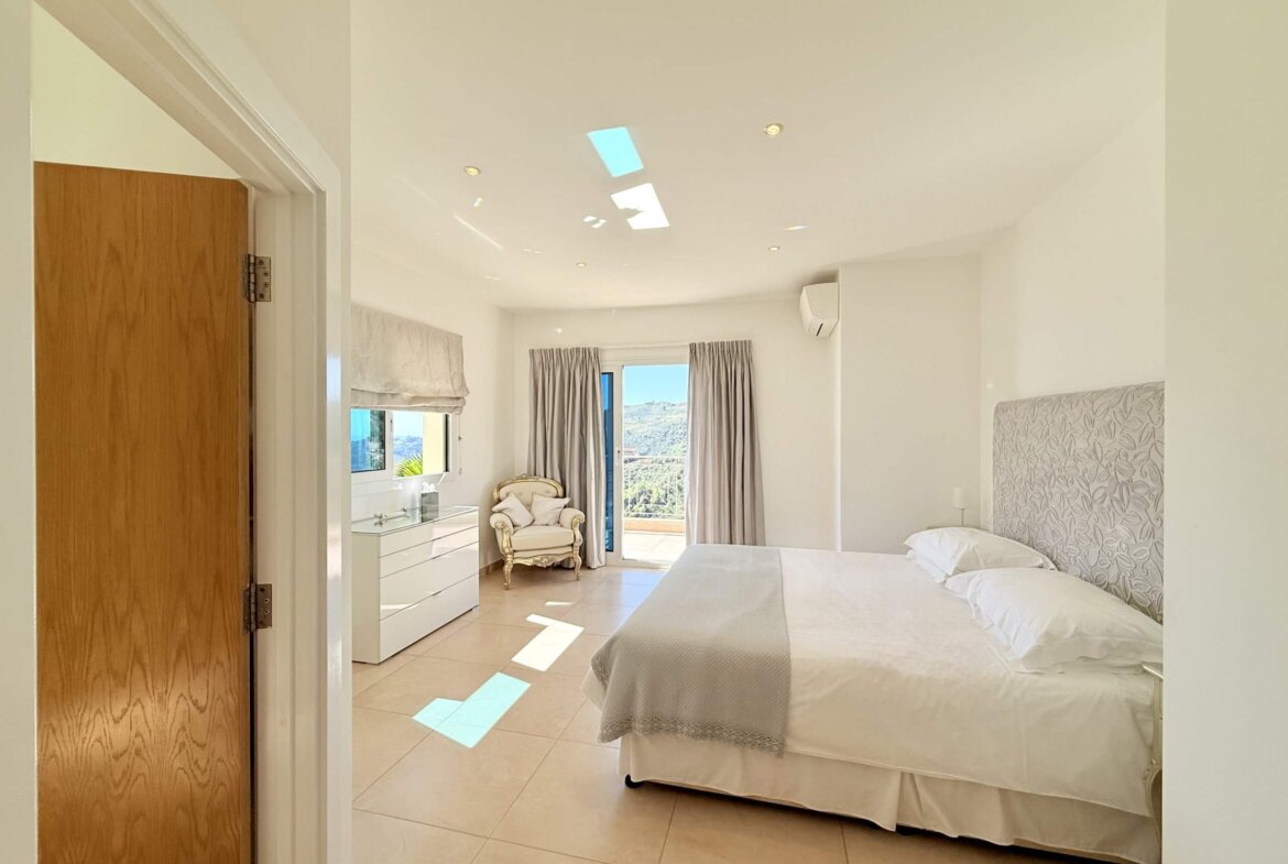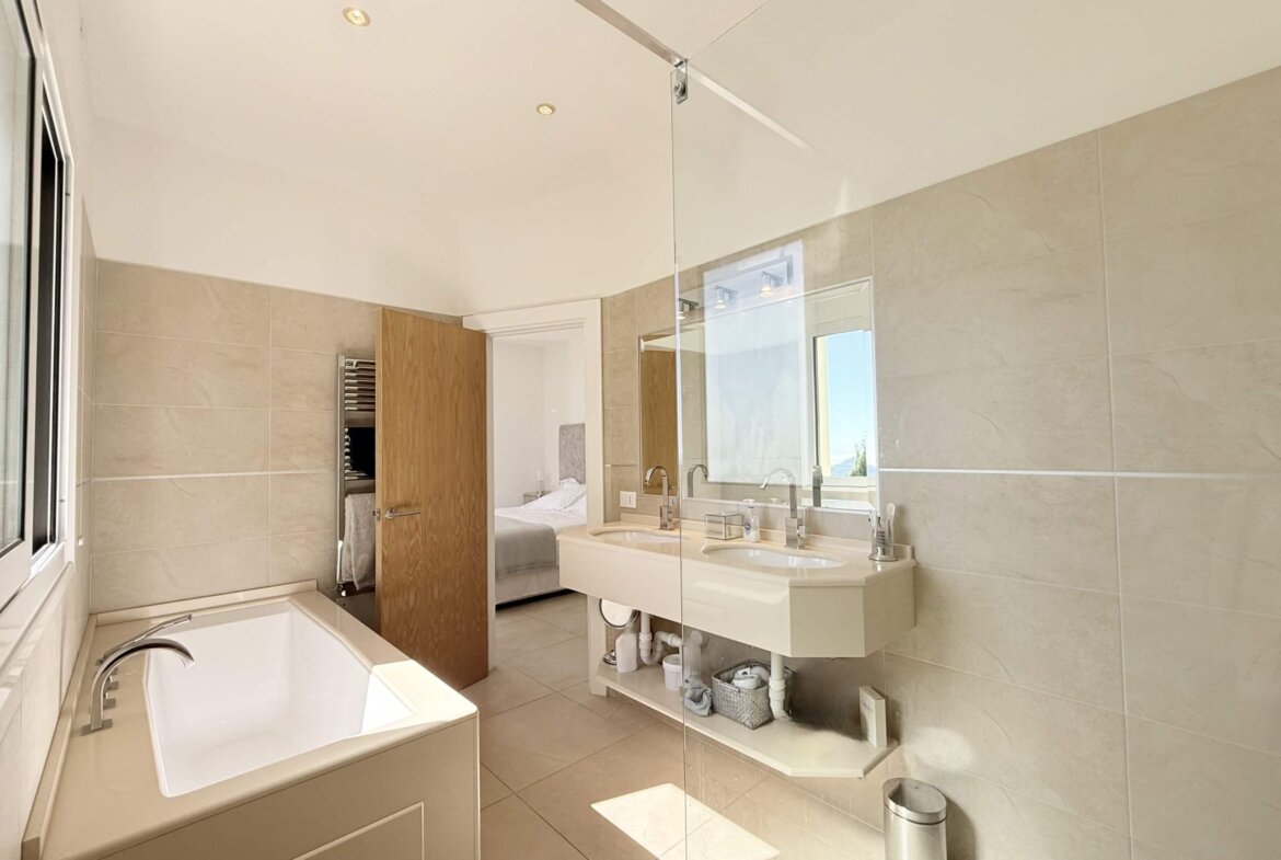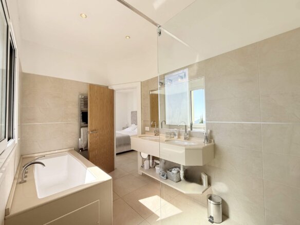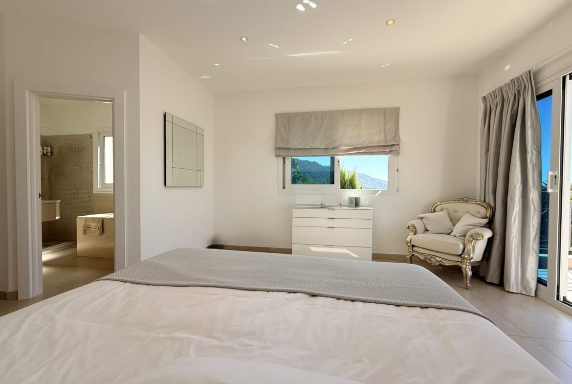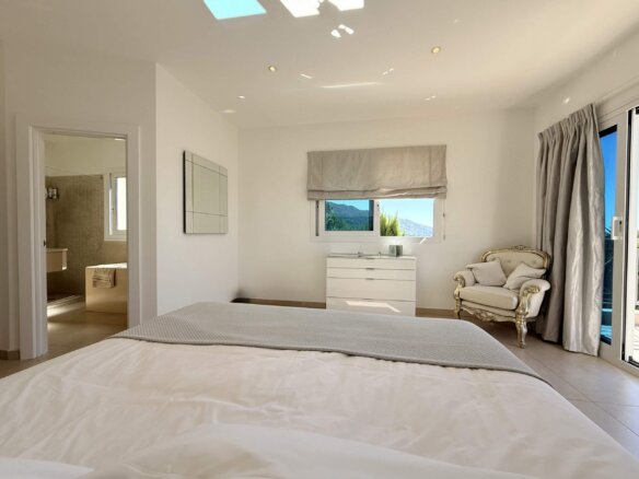 Die erste Etage beherbergt zwei helle, großzügige Schlafzimmer, jeweils mit eigenem Bad und Zugang zu einer privaten Terrasse oder Außenfläche. Das Hauptschlafzimmer mit begehbarem Kleiderschrank schafft einen privaten Rückzugsort mit besonderem Komfort.