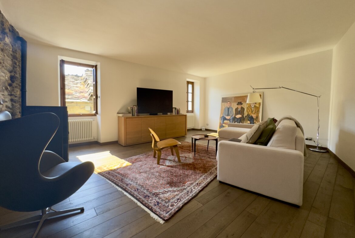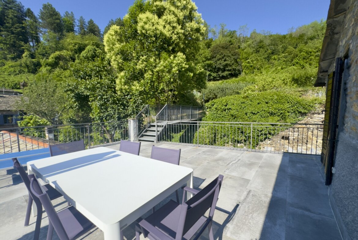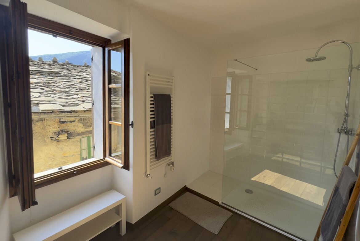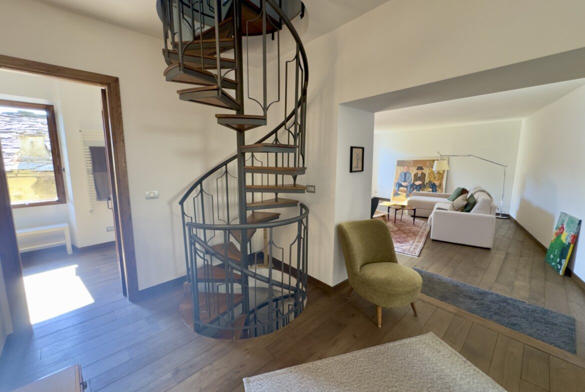 Im Herzen des malerischen ligurischen Dorfes Rezzo, eingebettet in eine der typischen Häuserzeilen des historischen Zentrums, erwartet Sie dieses liebevoll restaurierte Natursteinhaus mit einer Wohnfläche von rund 120 m², verteilt auf drei Etagen, die über eine bequem begehbare Wendeltreppe verbunden sind. Dank der Hanglage hat jede Etage einen direkten Zugang nach außen, was dem Haus eine besonders offene und helle Atmosphäre verleiht.
