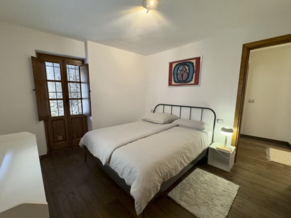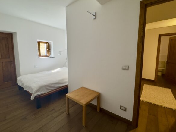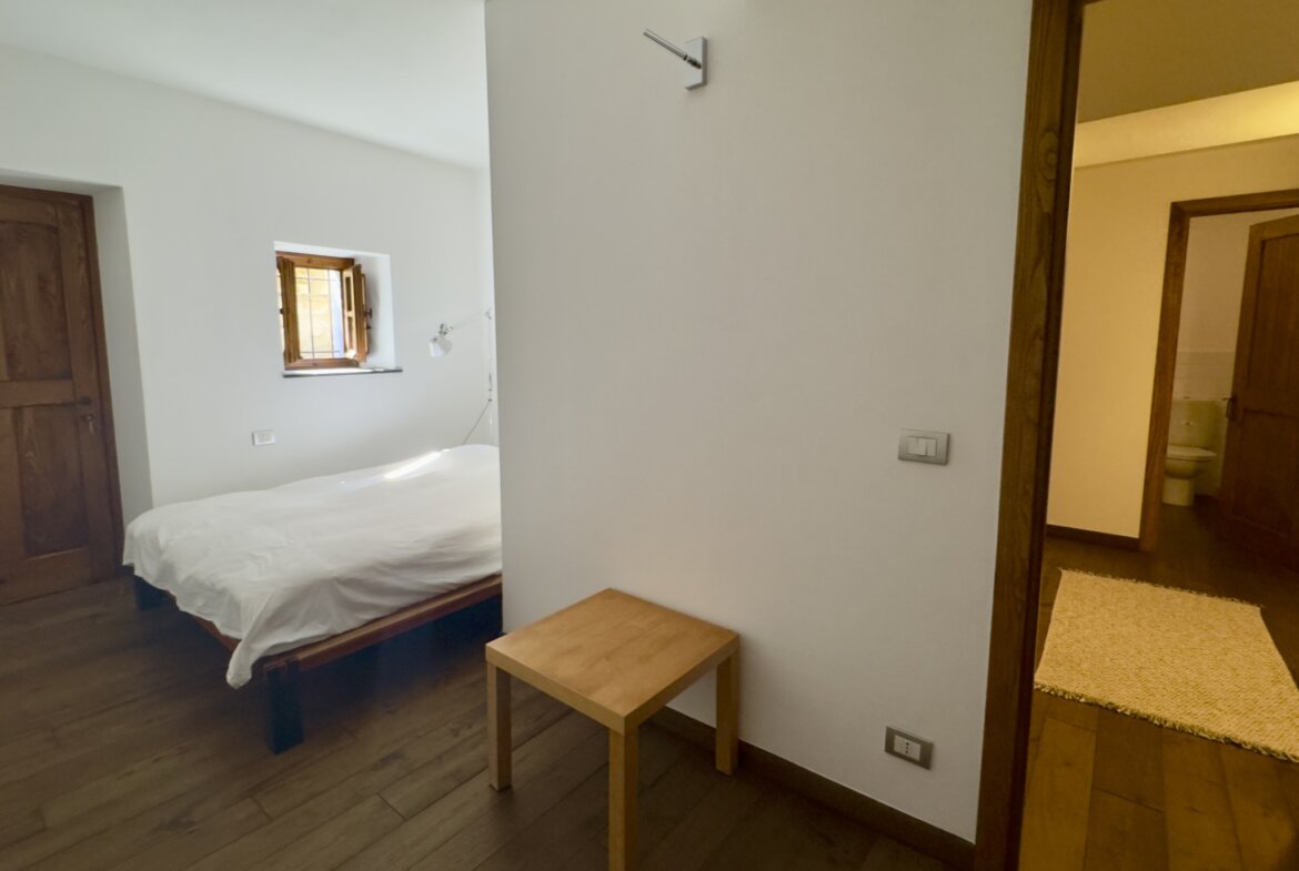 Die zweite Etage beherbergt die lichtdurchflutete Wohnküche mit Essbereich und Zugang zur etwa 40 m² großen, nach Süden ausgerichteten Panoramaterrasse. Von hier genießen Sie einen atemberaubenden Blick über das Valle della Giara – ein perfekter Ort zum Entspannen oder geselligen Beisammensein. Ein Steg führt direkt von der Terrasse über die Gasse in den ca. 136 m² großen Garten mit verschiedenen Obstbäumen. Auch dieser verfügt über einen eigenen Zugang von der Gasse. Auf dem Grundstück befindet sich außerdem eine Rustico-Ruine mit rund 46 m² Grundfläche, die sich zum Wiederaufbau anbietet.