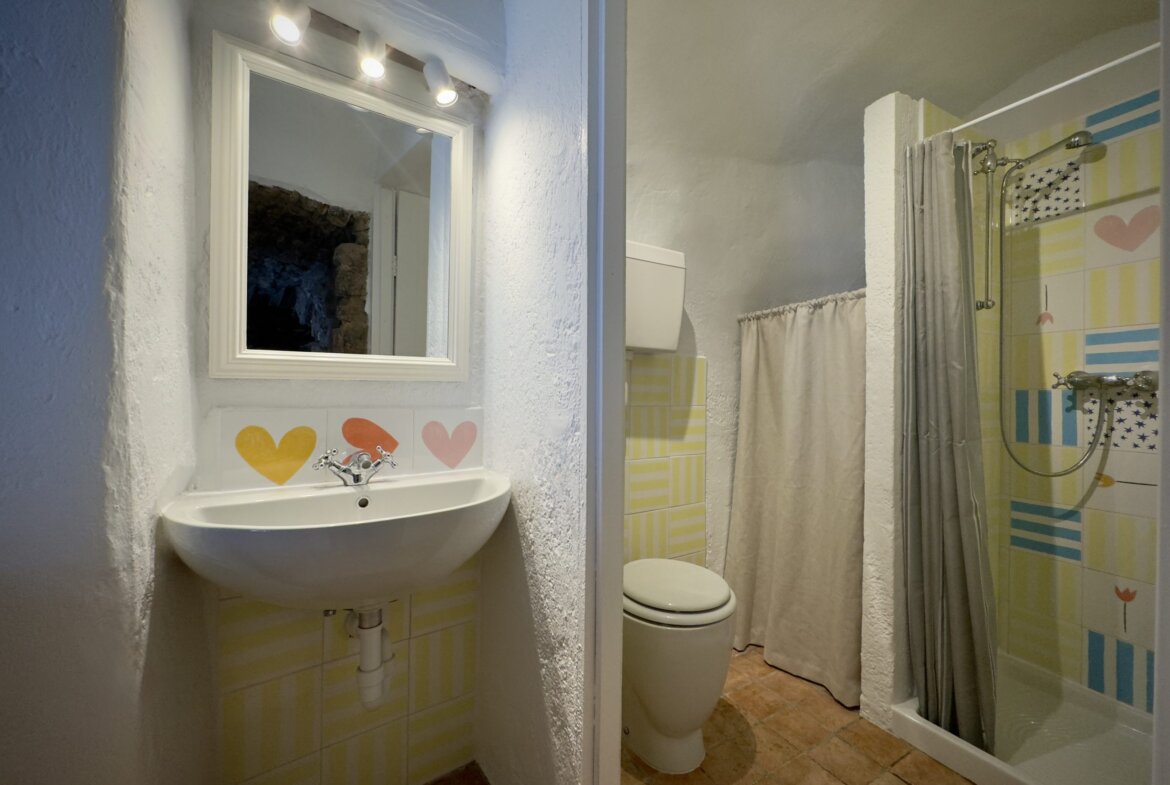 The approx. 35 m2 are designed as open plan living, stretching over one floor level. The entrance opens right into the living area with integrated open kitchen. A French window opens out on the balcony with views over the picturesque mews of Apricale. A natural stone arch separates from the cozy bedroom with adjacent shower room.