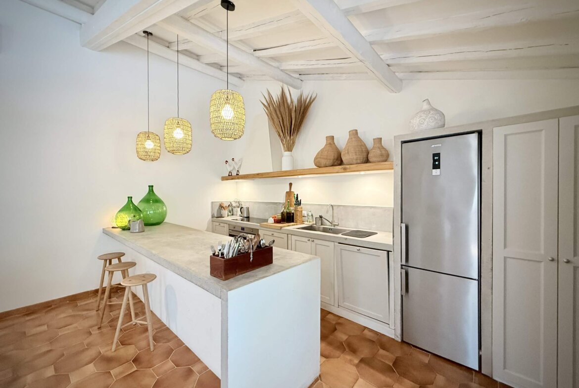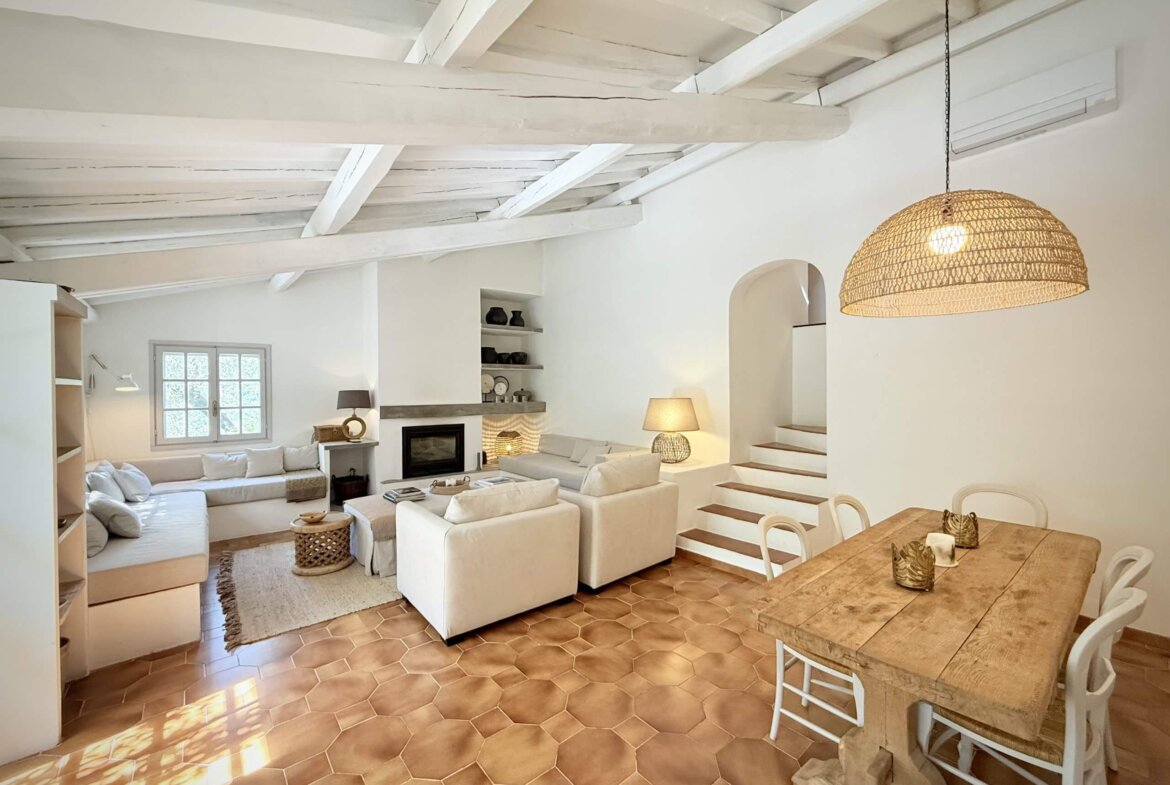 The main house, approximately 118 m², is located in a particularly quiet and secluded part of the estate and exudes a warm, inviting atmosphere. Upon entering, one is greeted by a large, sun-drenched terrace, covered by a pergola adorned with wisteria that blooms spectacularly in spring. This terrace is perfect for relaxed outdoor living and seamlessly connects to the open-plan living area. Flooded with natural light, this space combines a lounge, dining area, and open kitchen into a harmonious whole and is distinguished by an exceptionally high ceiling extending to the roof, giving the interior a spacious and airy feel. The modern, large kitchen island encourages cooking and socialising, while the open fireplace provides a cosy warmth and welcoming atmosphere – the ideal setting for convivial evenings with family and friends. An elegant, open staircase links the living area with the slightly elevated sleeping quarters, creating a harmonious connection between both levels. The upper level comprises two charming and comfortable bedrooms, filled with light and offering a serene, cosy ambience, alongside a modern, stylish shower room that reflects the high design standards of the house. On the ground floor, a spacious utility room provides additional convenience and storage space, ideal for household organisation or garden furniture.