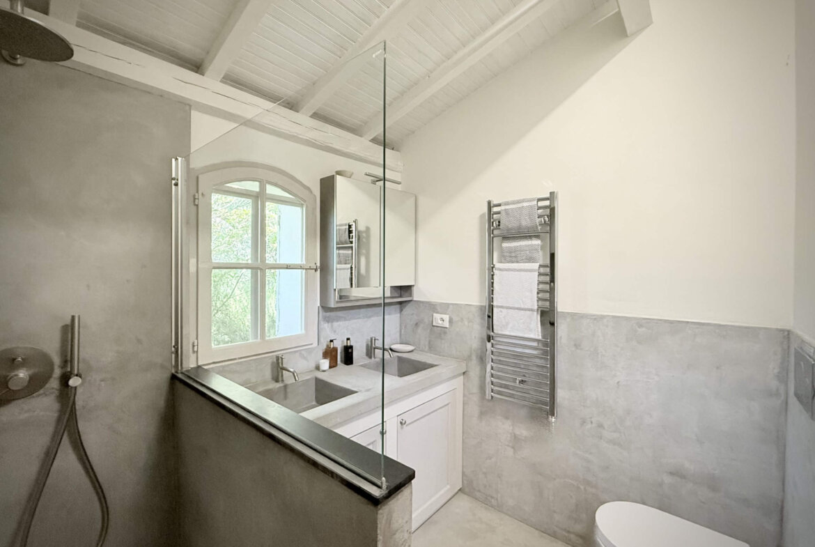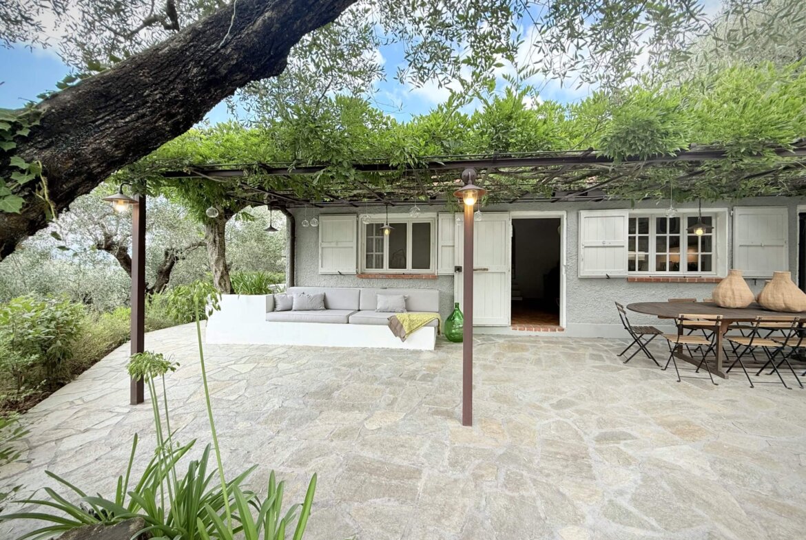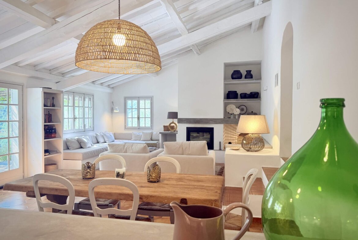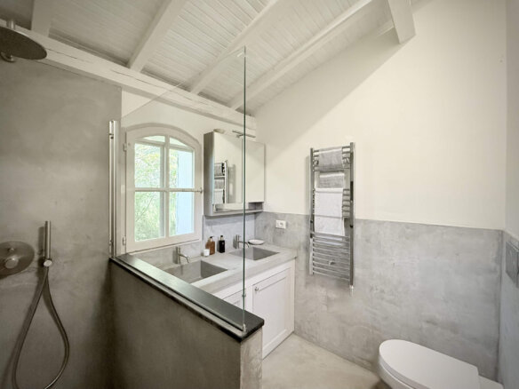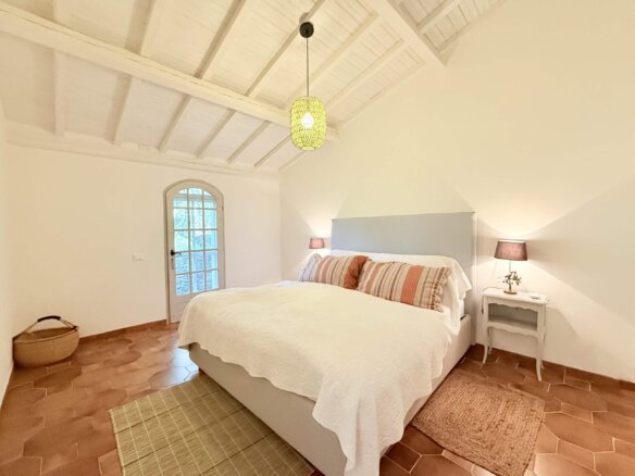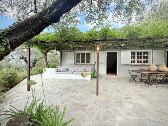 The estate extends over approximately 8,400 m² of terraced, fenced land with an olive grove and comprises two independent houses with a total of 6 bedrooms and 5 bathrooms. Both houses have been recently refurbished in a modern country style, featuring a palette of whites and subtle greys. The bathrooms are designed with a contemporary, understated aesthetic that blends harmoniously with the overall modern design. The property not only offers beautifully landscaped outdoor spaces but also presents numerous development opportunities, such as the potential construction of a swimming pool.