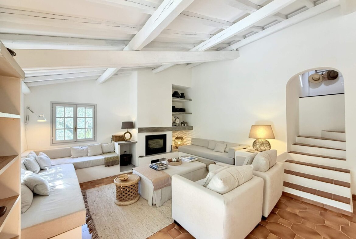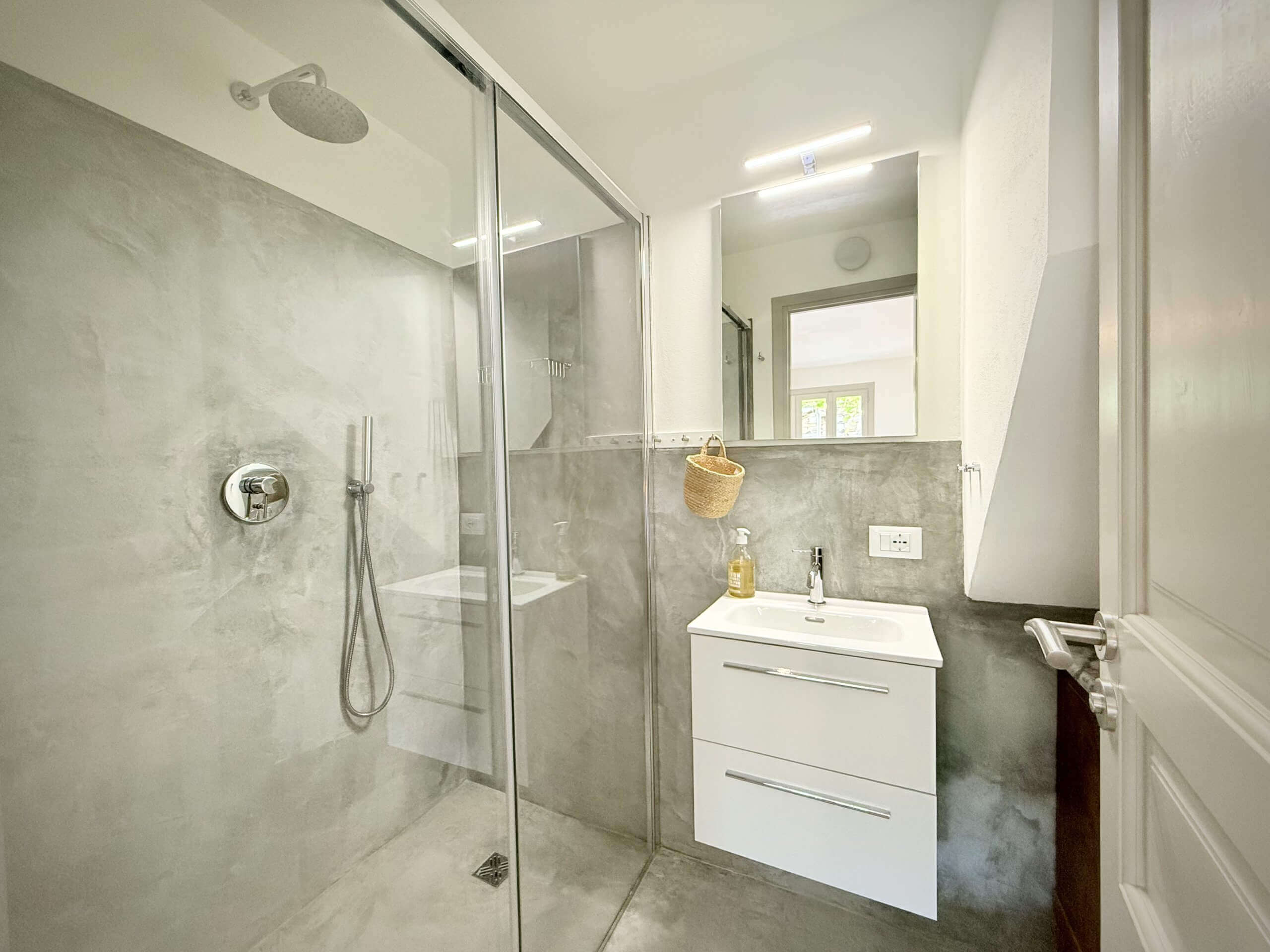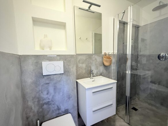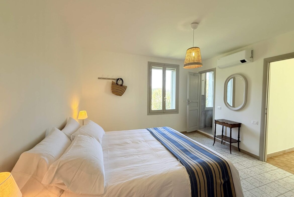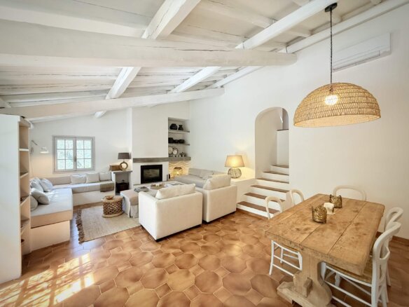 The estate extends over approximately 8,400 m² of terraced, fenced land with an olive grove and comprises two independent houses with a total of 6 bedrooms and 5 bathrooms. Both houses have been recently refurbished in a modern country style, featuring a palette of whites and subtle greys. The bathrooms are designed with a contemporary, understated aesthetic that blends harmoniously with the overall modern design. The property not only offers beautifully landscaped outdoor spaces but also presents numerous development opportunities, such as the potential construction of a swimming pool.