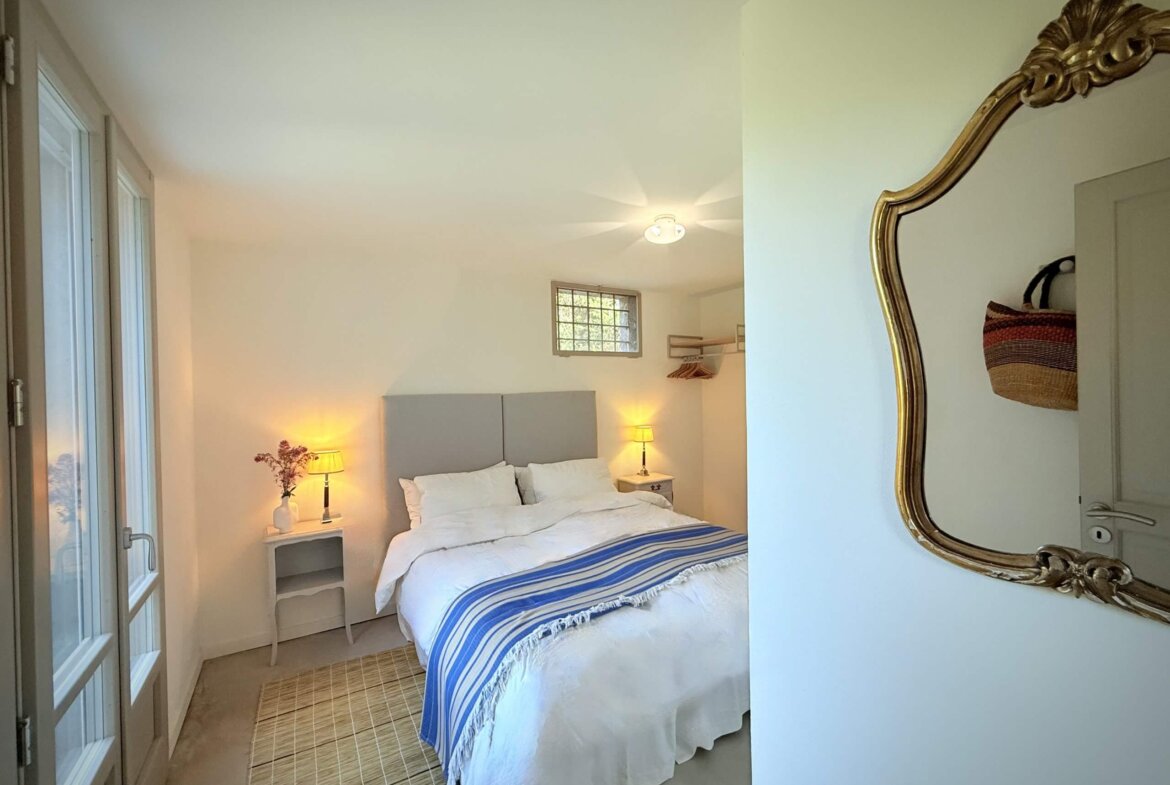 A short walk leads to the guest house, which offers approximately 80 m² of living space over two floors. It features four modern, spacious bedrooms, each with a private en-suite bathroom. One of the rooms is equipped with an open fireplace and has access to a private sun terrace with a summer kitchen. One of the ground-floor bedrooms already has connections for a kitchen, allowing the guest house to be used independently if desired. Both houses also benefit from separate driveways, enabling them to be used individually or together.