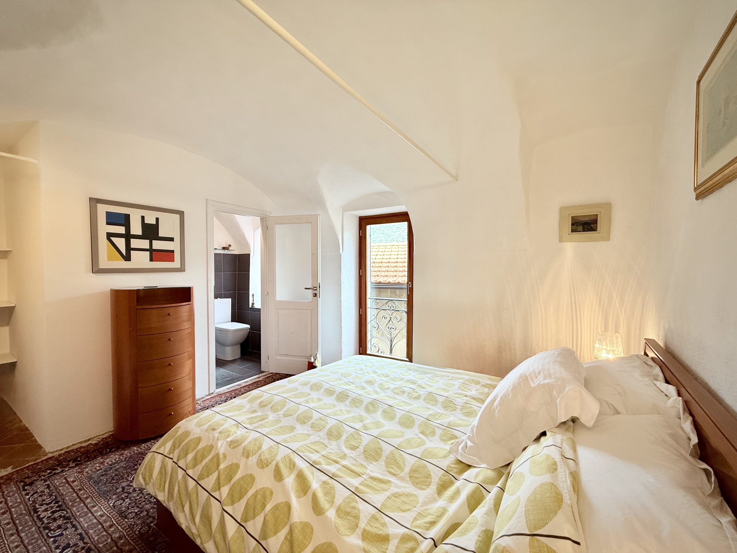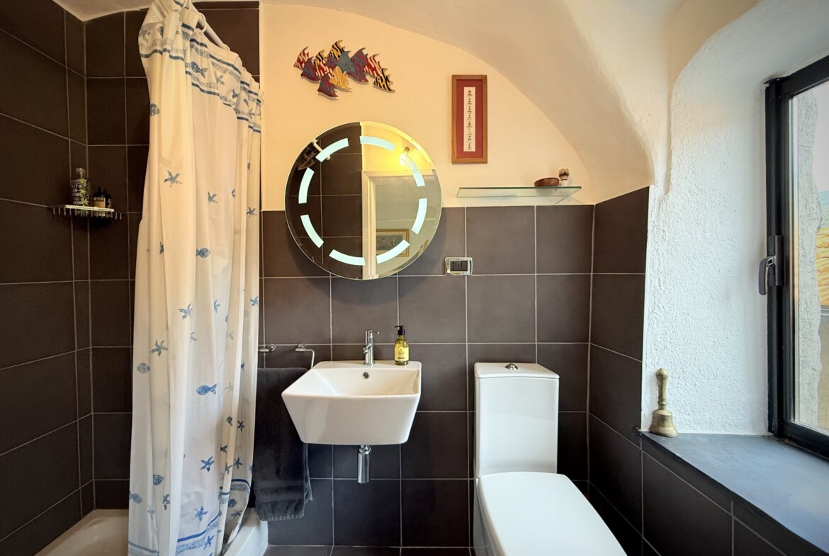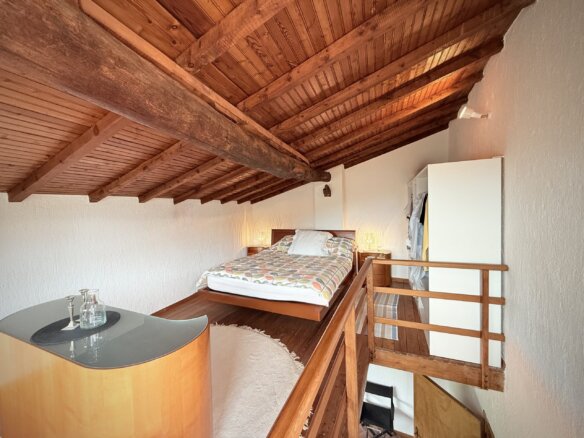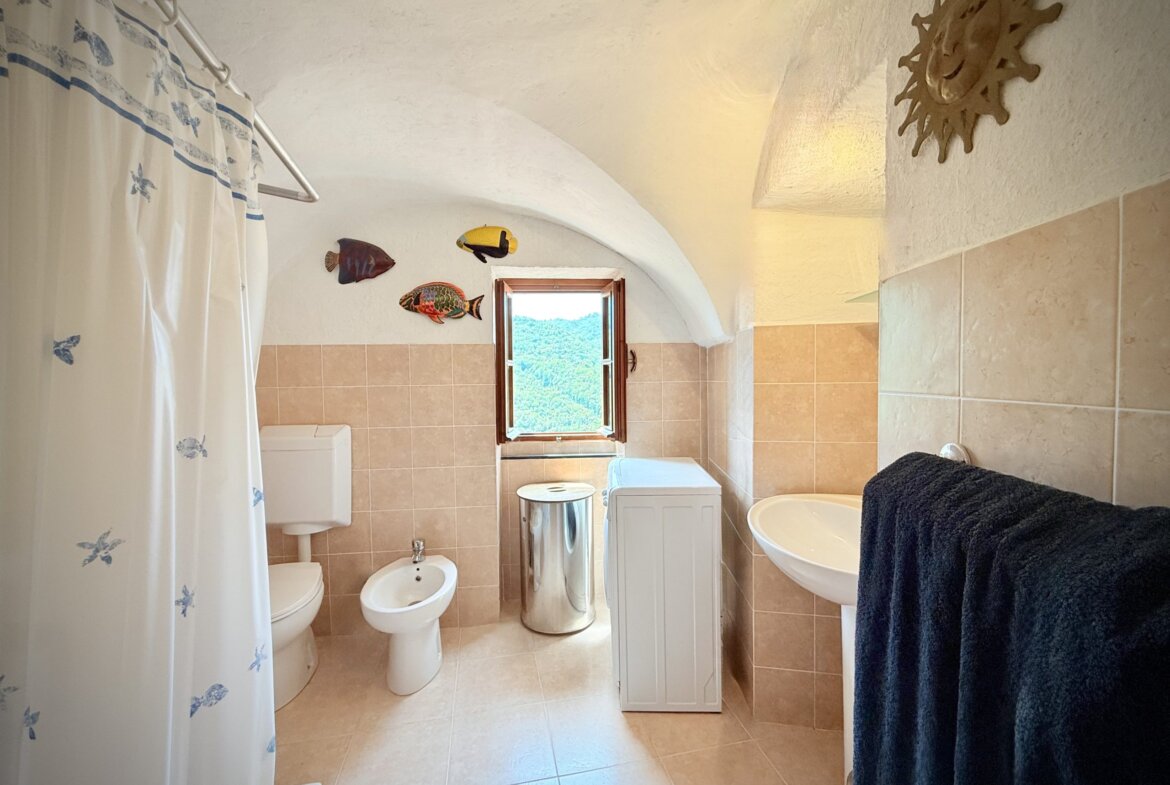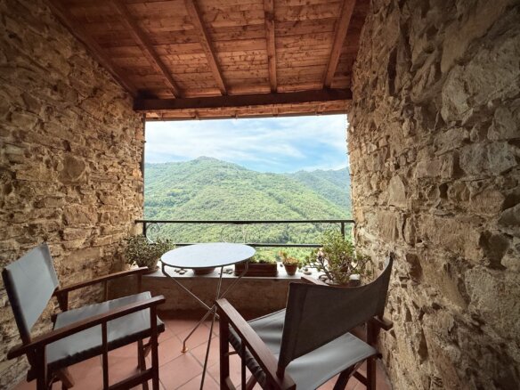 The attic floor features an open galleried area with sleeping facility situated above the living area below. This light flooded room with a north facing window used to be an artist’s studio and still oozes a particular creative ambience. There is also a guest toilet located on this level. The gallery room enjoys direct access to the spacious roof terrace with sweeping views over Apricale.