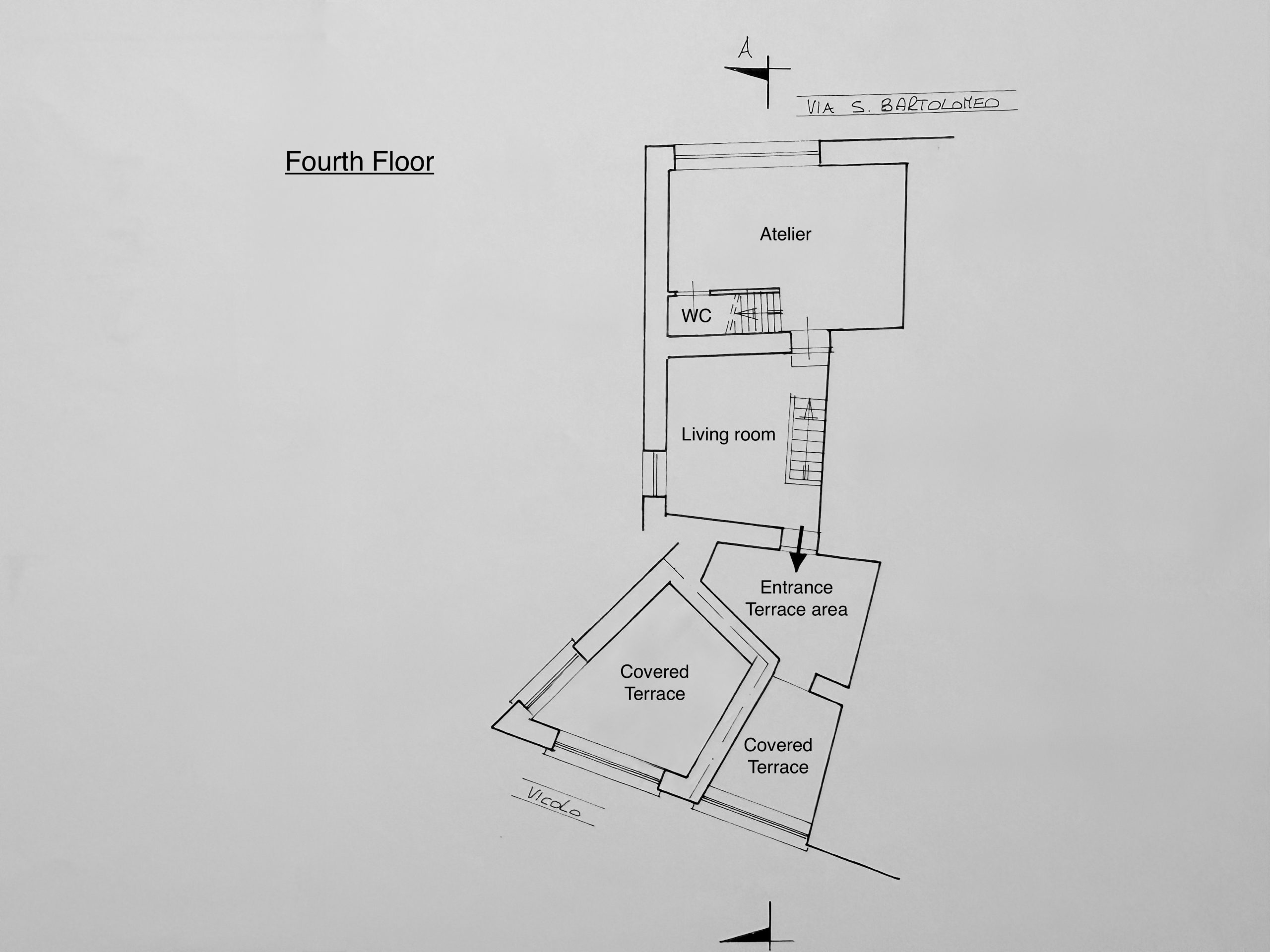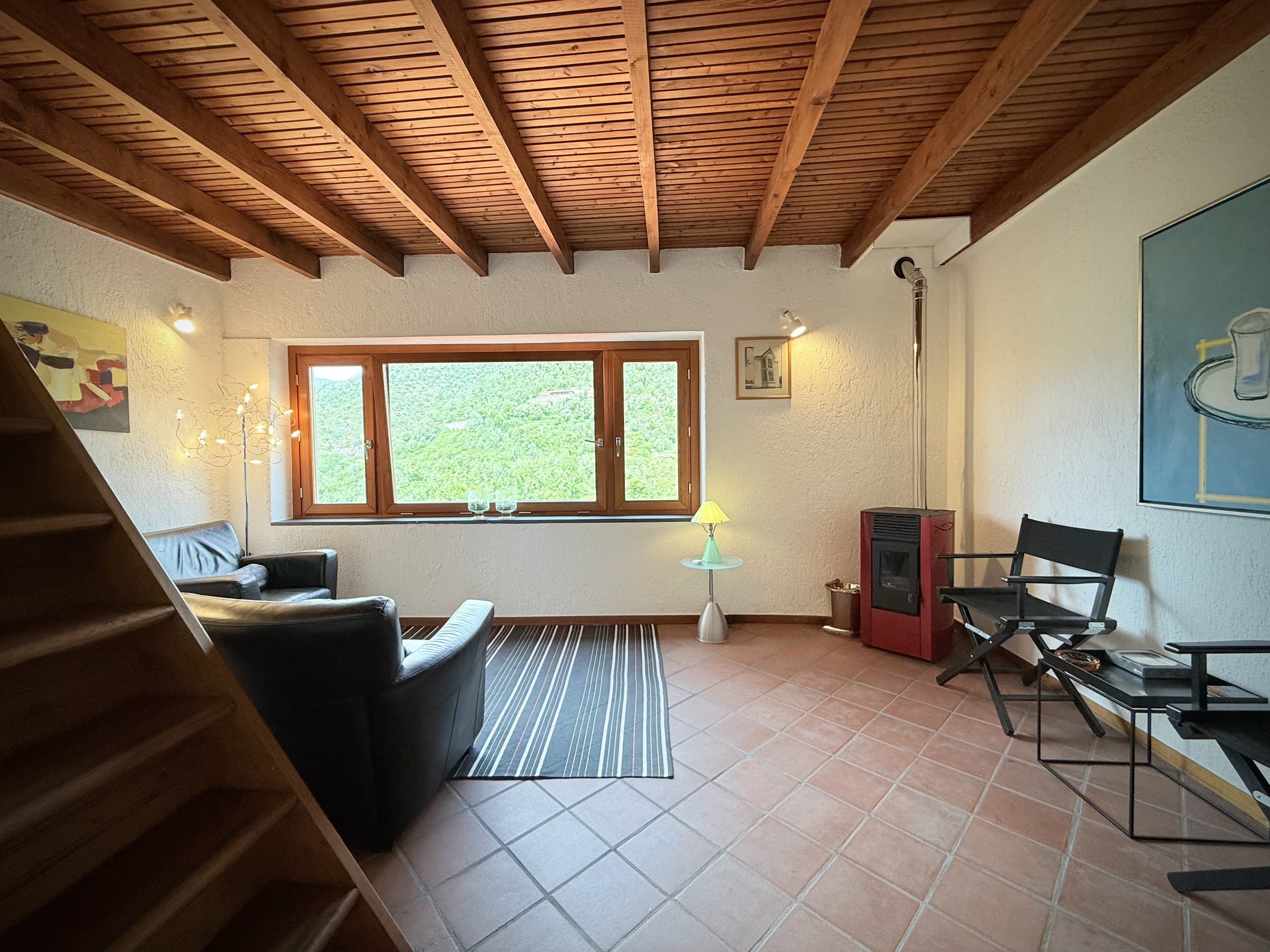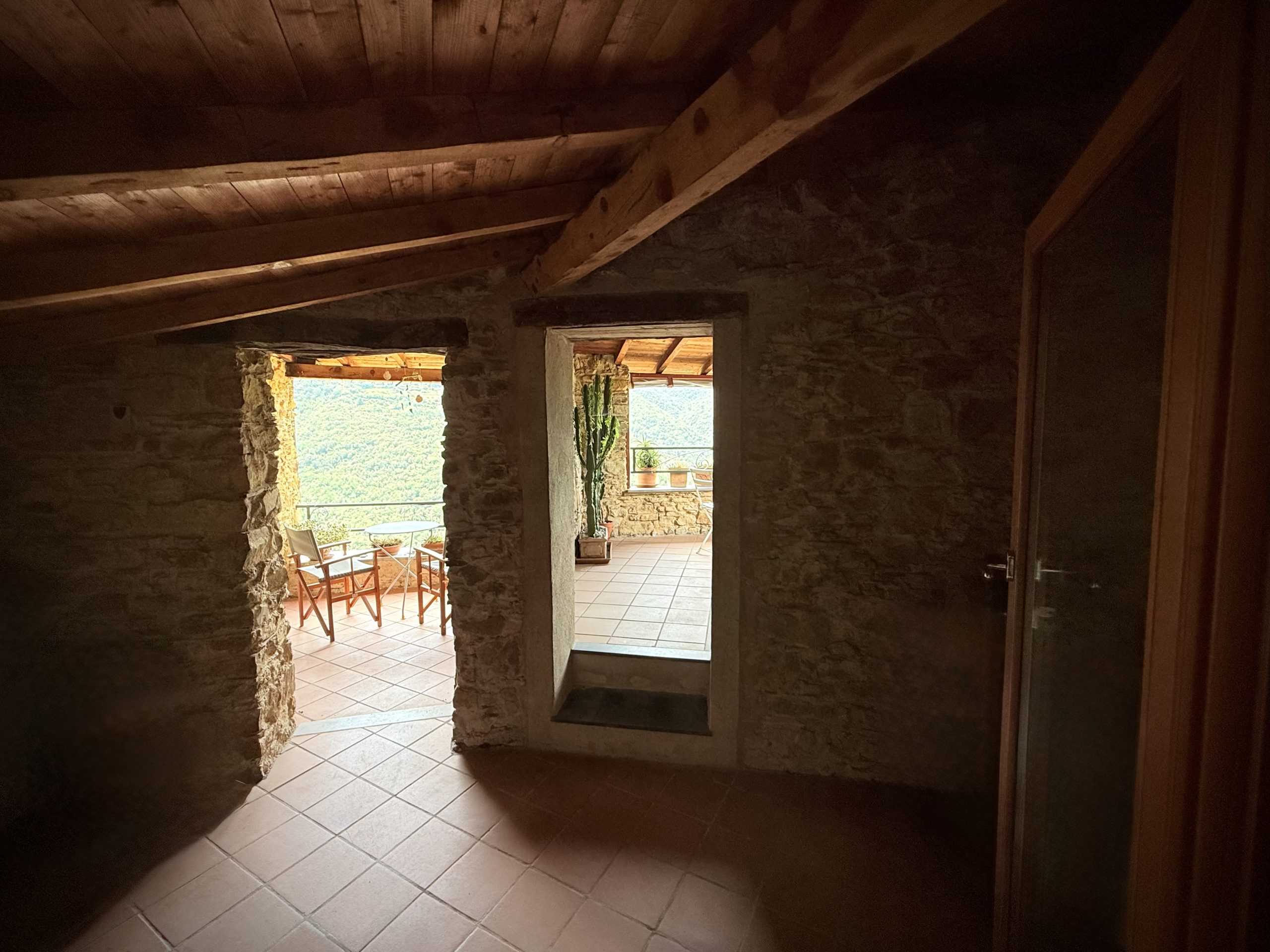 The attic floor features an open galleried area with sleeping facility situated above the living area below. This light flooded room with a north facing window used to be an artist’s studio and still oozes a particular creative ambience. There is also a guest toilet located on this level. The gallery room enjoys direct access to the spacious roof terrace with sweeping views over Apricale.