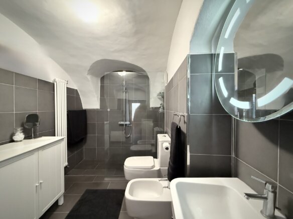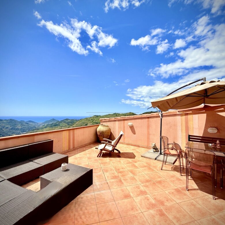 On the next floor up are the elegant dining room and a bedroom with private bathroom and dressing area. On the fourth floor a two further living areas – one of which has access to two roof covered panoramic terraces where to relax and entertain. From here, stunning views over the surrounding rolling hills and the mountain village Perinaldo can be enjoyed.