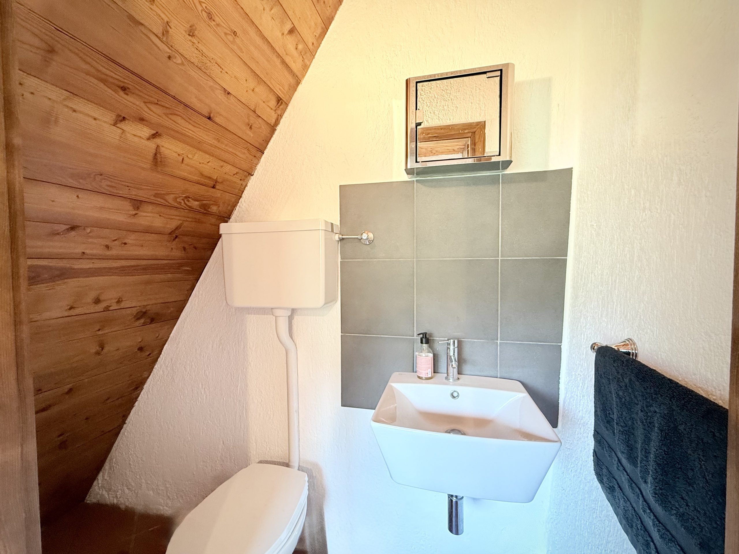 A communal interior staircase leads to the entrance and into a spacious entrance hall on the second floor with stylish vaulted ceilings, currently used as breakfast room. The room opens straight into the bright and well-equipped kitchen. Also on this floor level are the newly renovated modern shower room and a comfortable living room with open fireplace.