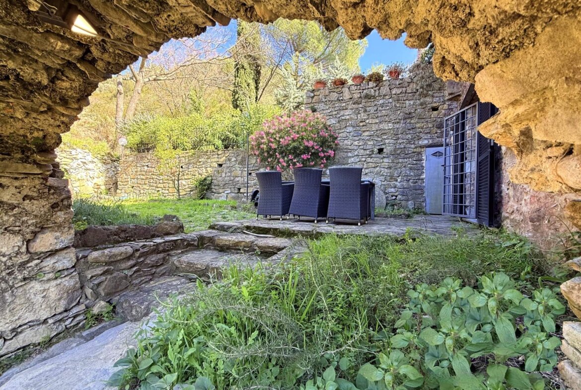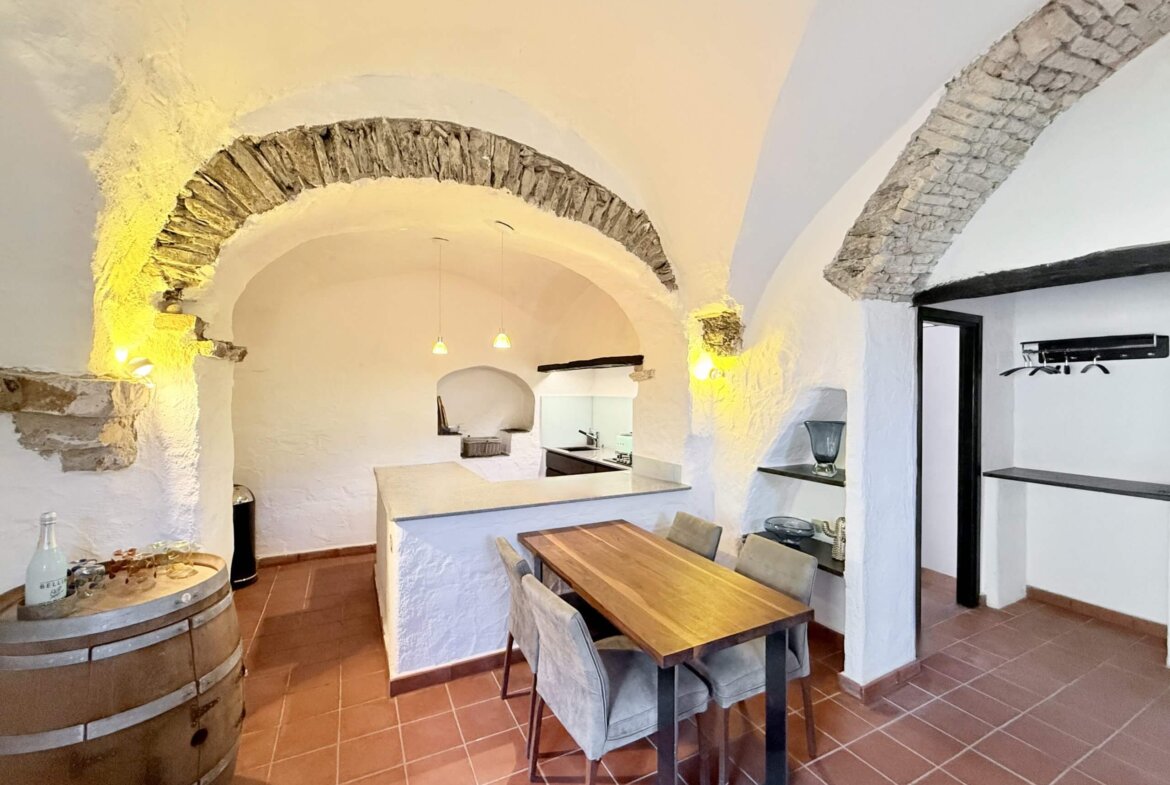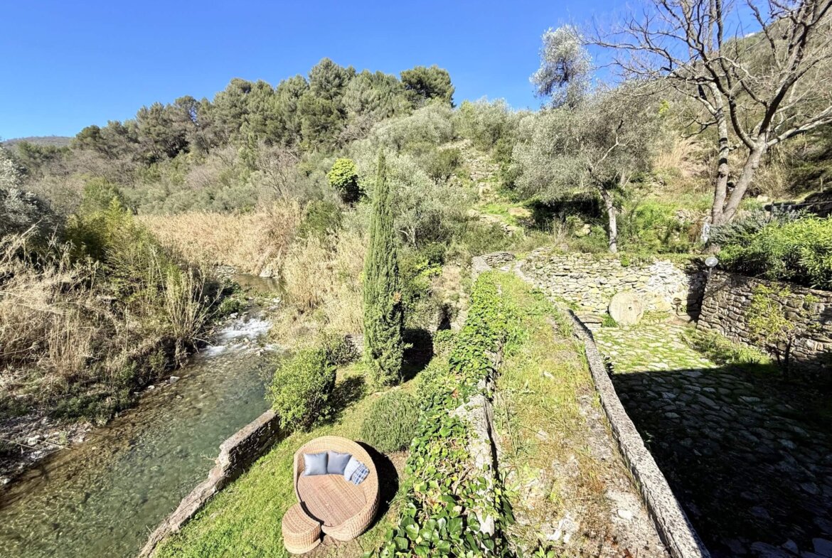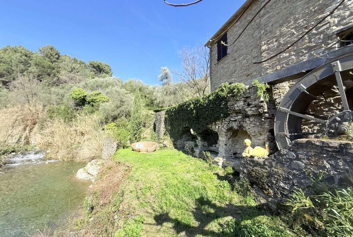 The apartment for sale, measuring approximately 70 sq m, is situated on the ground floor and captivates with its beautiful high ceilings and vaulted arches. The entrance leads directly into the spacious living area: to the right, a cosy sitting area with fireplace; to the left, an open-plan, superbly equipped kitchen with dining area. Two bedrooms and an impressive shower room complete the accommodation. In front of the living area lies a delightfully romantic courtyard with a natural stone terrace. A stone archway leads into the approximately 255 sq m garden, planted with oleander, rosemary and other Mediterranean plants. An idyllic seating area beneath the old mill wheel invites you to linger, offering lovely views of the river and the surrounding olive groves.