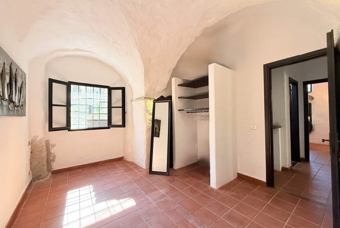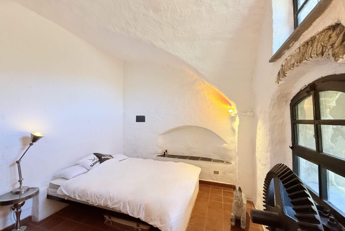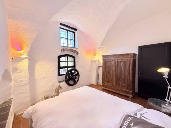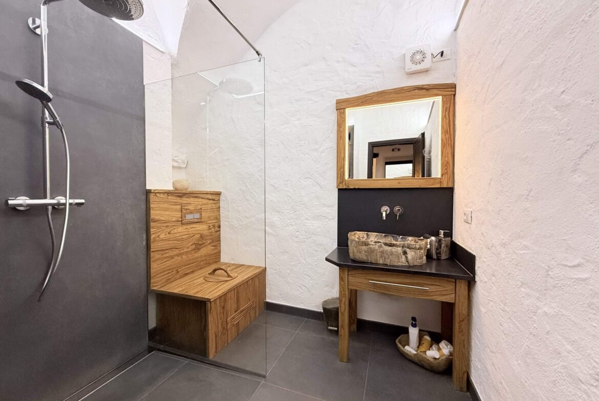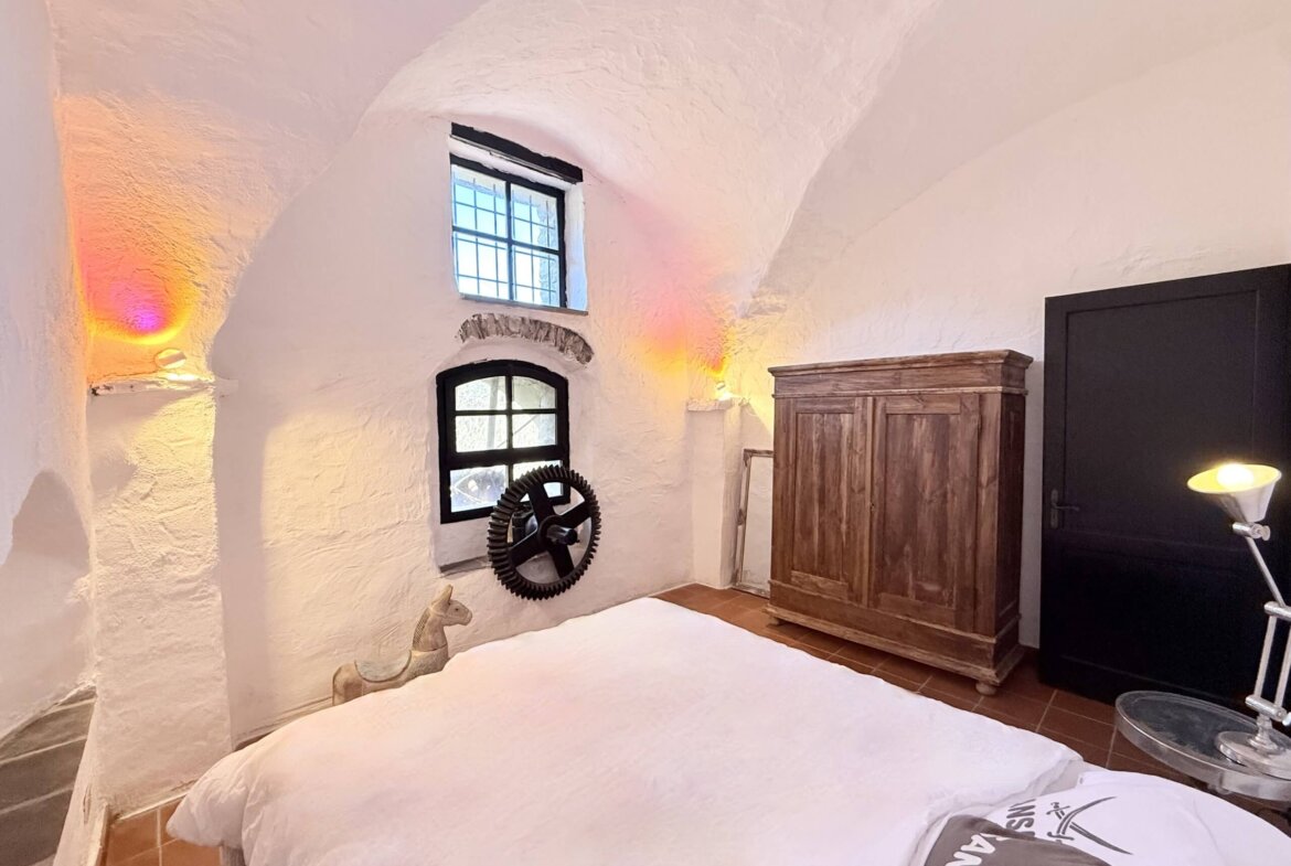 The apartment for sale, measuring approximately 70 sq m, is situated on the ground floor and captivates with its beautiful high ceilings and vaulted arches. The entrance leads directly into the spacious living area: to the right, a cosy sitting area with fireplace; to the left, an open-plan, superbly equipped kitchen with dining area. Two bedrooms and an impressive shower room complete the accommodation. In front of the living area lies a delightfully romantic courtyard with a natural stone terrace. A stone archway leads into the approximately 255 sq m garden, planted with oleander, rosemary and other Mediterranean plants. An idyllic seating area beneath the old mill wheel invites you to linger, offering lovely views of the river and the surrounding olive groves.