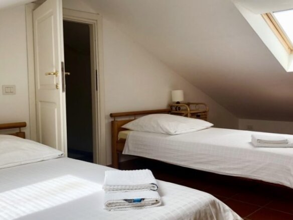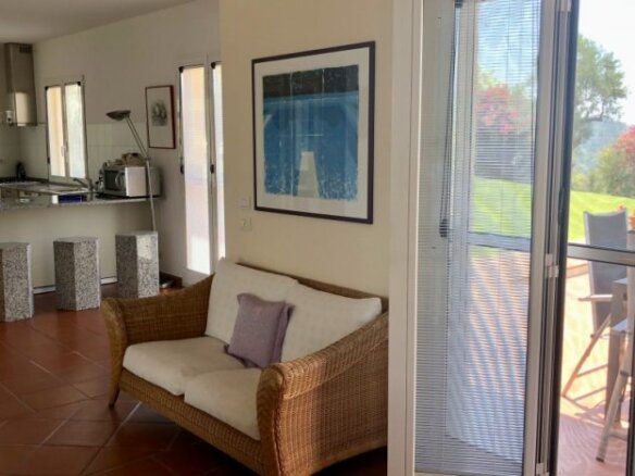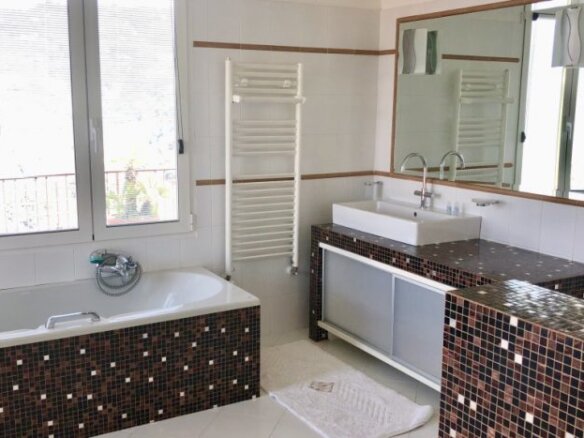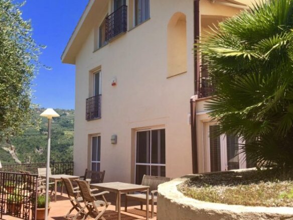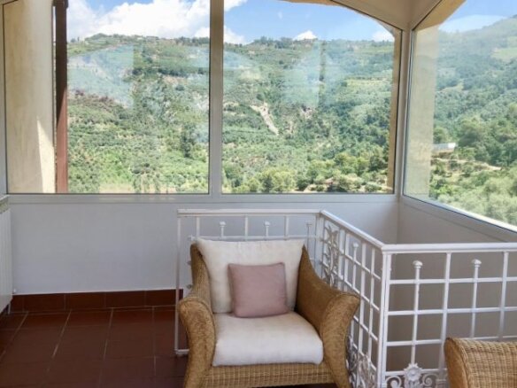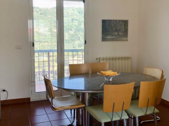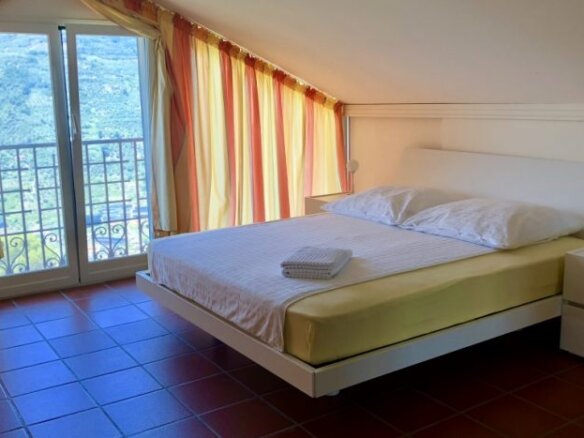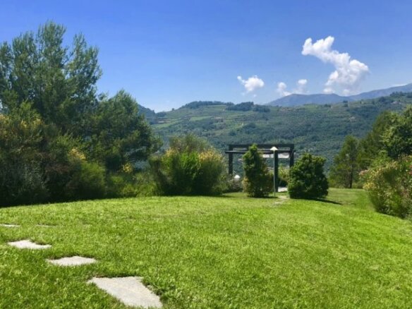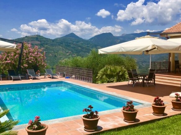 Bella Vista is a spacious, modern villa located on a gently sloping hill, some 3.5km above the medieval village of Dolceacqua. The surrounding grounds measure several 1000qm. A well-kept lawn with swimming pool is right outside the house and invites guests to lounge in the sun and enjoy the wide panoramic views over the Maritime Alps and the sea. The spacious living space is split over two levels. The house entrance is on the middle floor level; so are the living room with open fireplace, the open-plan kitchen, dining room and two shower rooms. On the lower floor level are the master bedroom, a shower room and the Finnish sauna with relaxation area. The converted attic provides one studio room (double bed) and one twin bedroom. An open staircase leads from the living room into the attic. The overall equipment of the house is of a high standard and all furniture has been tastefully selected. Near the swimming pool is also a steam room, a shower and changing rooms. Off-street parking is available on the grounds.