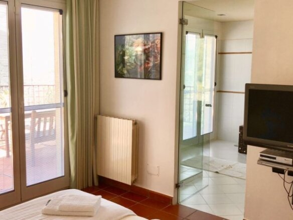 - Spacious terraces with garden furniture and large sun umbrella, sunbeds