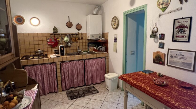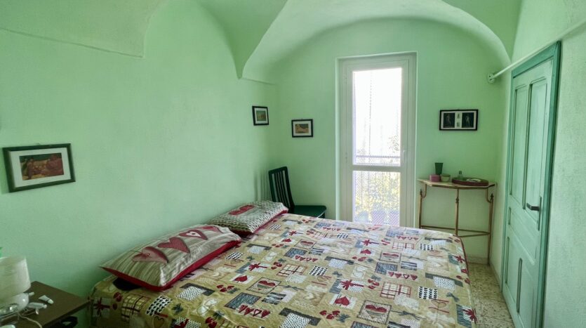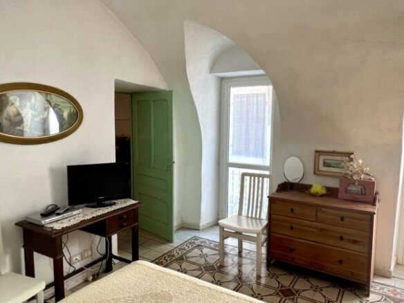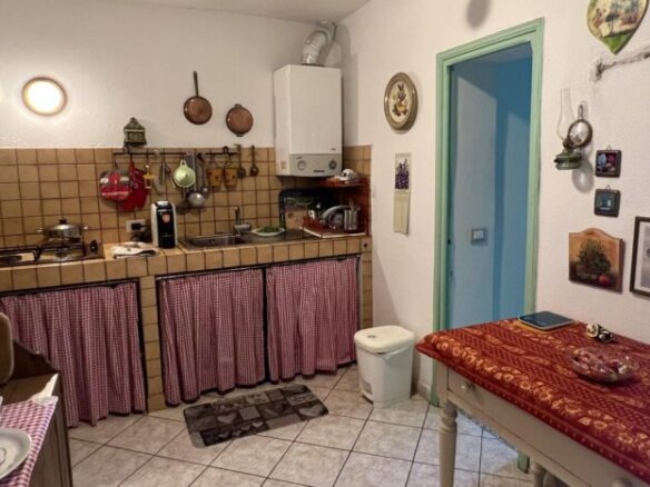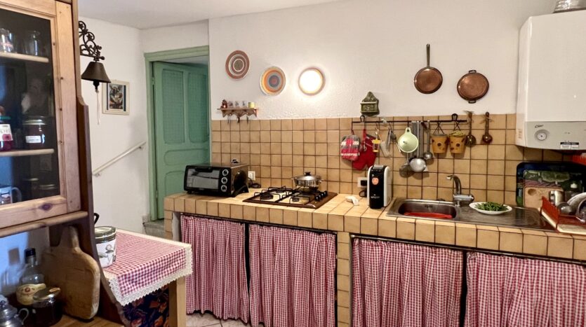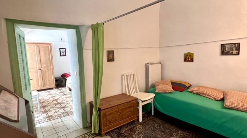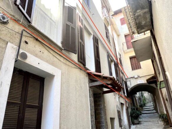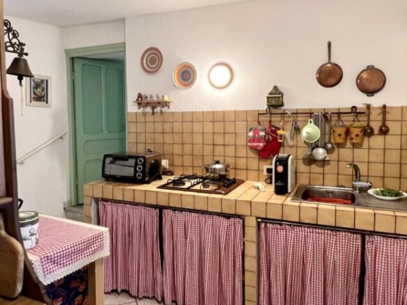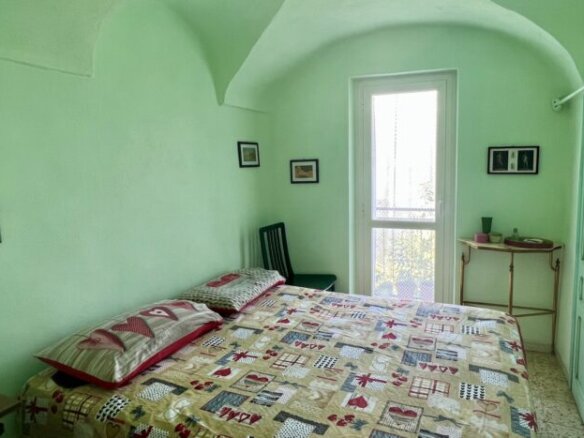 This 70qm flat was renovated in 2003 and forms part of a village house in the historic centre of Perinaldo. It is situated at 1st floor level and has step free access. The entrance opens into a little hall and then straight into the kitchen; to the left is a shower room and to the right follow the living/dining room and one bedroom. Both rooms have glass doors opening out on a small balcony with attractive views over the mountains and Apricale nestling in the village below. Arranged on the left hand side of the kitchen and with views over the mews are two further bedrooms, one of which is a passage room. The living room and bedrooms feature traditional vaulted ceilings and in parts the genuine old flooring has been maintained. The flat is conveniently fitted with gas central heating (communal gas mains) and insulated windows with shutters.