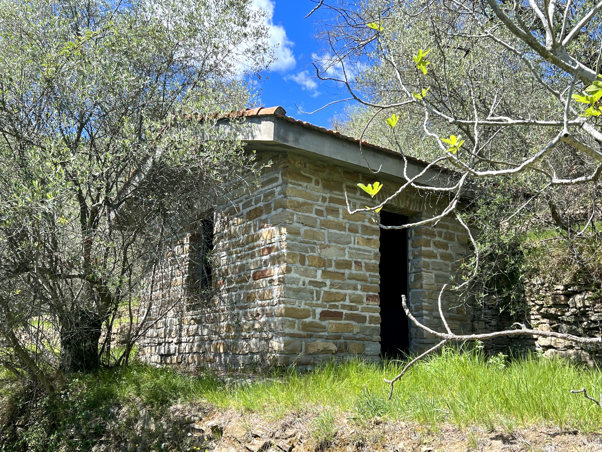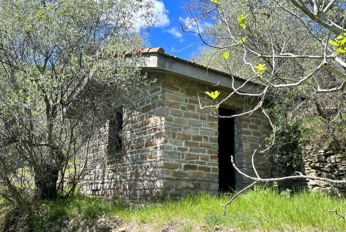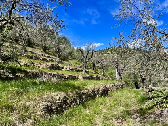 The 12,148 m2 plot of land for sale above Dolceacqua, Liguria, is planted with olive trees of the Taggiasca variety and the gently sloping terraces are perfectly suited for agricultural use. On the grounds for sale in Liguria stands a shell of a building, part of the sale, with the upper floor measuring 70 m2 living space and a 20 m2 loggia; the approx. 60 m2 storage and usage space on the ground floor could be converted into living space. Electricity and water mains are on the plot of land for sale. Two further old natural stone buildings, also part of the sale, (12 m2 each) are in good condition and provide potential for further extension. The building index allocated to the grounds for sale in Liguria allow for a new building measuring 100 m2 living space and 100 m2 usage space.