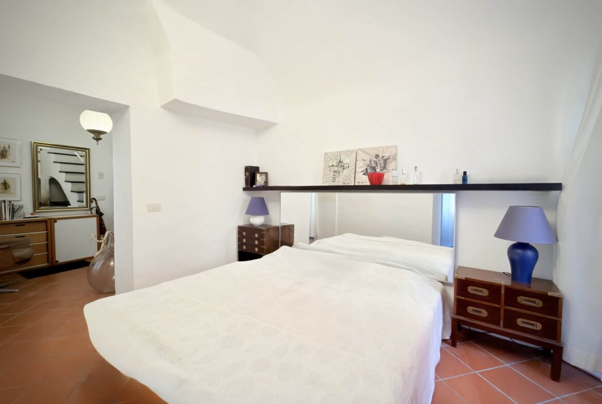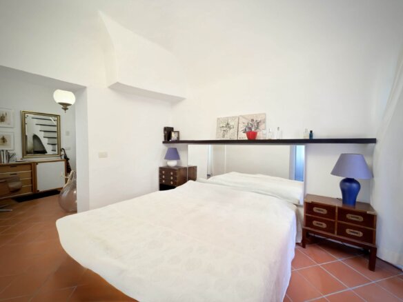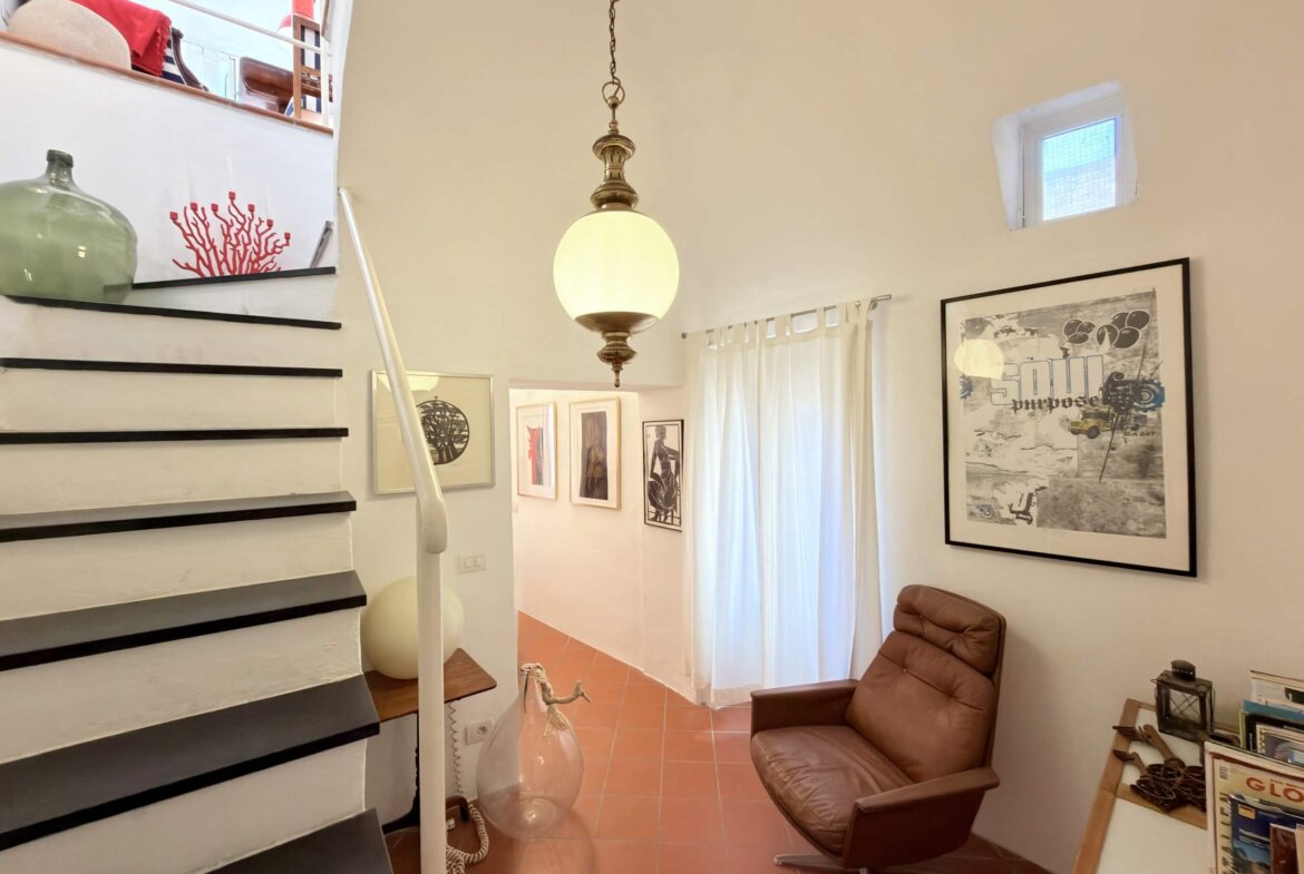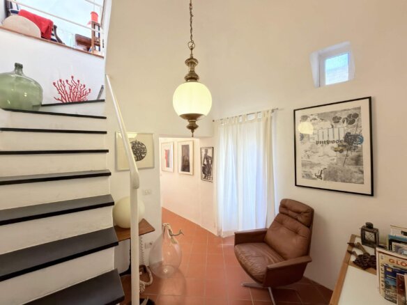 The house is accessed from a typically Ligurian mews and a communal staircase shared with one other party. On the ground floor lies the spacious entrance hall with adjacent cosy bedroom and family bathroom.