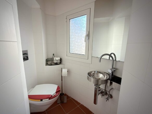 Following on the first floor are the light flooded living and dining area with open plan kitchen. This room with its Mediterranean flair invites to entertain family and friends. One guest toilet is also located on this floor level.