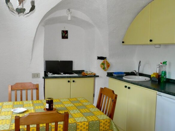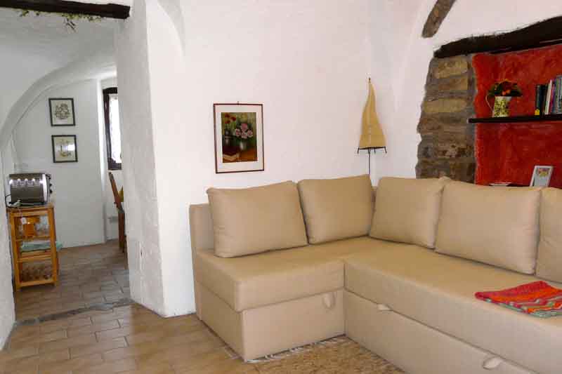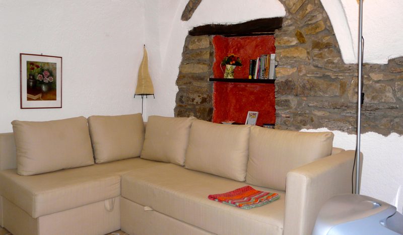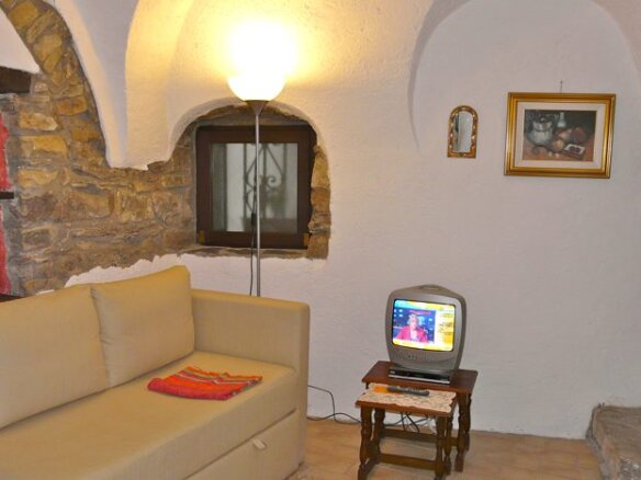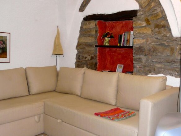 The ground floor flat is part of a typically Ligurian natural stone house and offers 36 qm living/usage space on one floor level. The flat opens into a small entrance hall, leading on into the living room. Revealed stone walls and vaulted ceilings create a romantic ambience and a number of built in cupboards, provide ample storage space. The living room gives access to the comfortable bathroom and the functionally designed eat-in kitchen and the bedroom with a small work place, follows on from here. The flat gives beautiful views over the valley and the surrounding hills but does not have any outside space. The property was completely renovated in 2003 and is in very good condition.