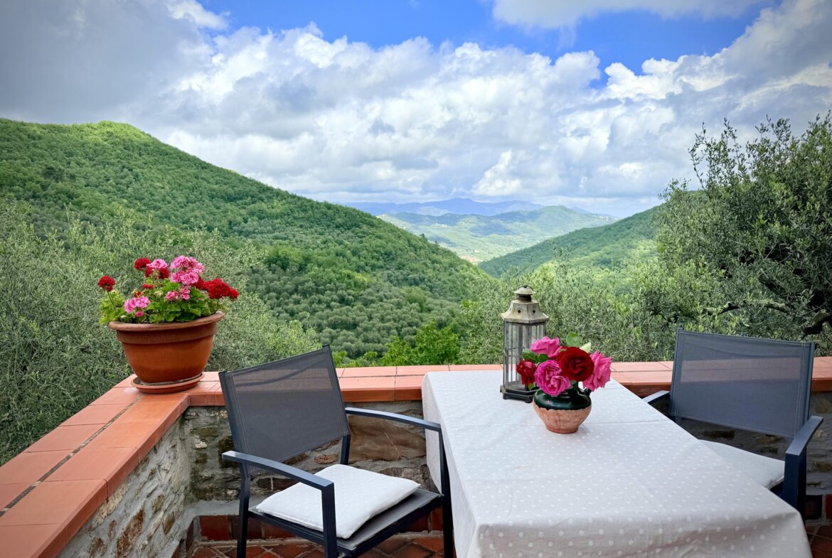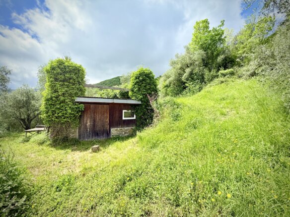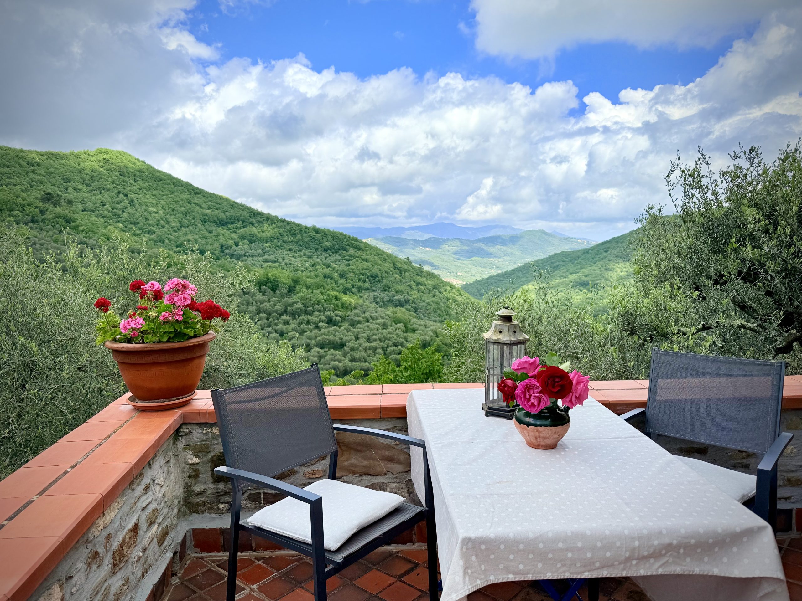 Right above the house is another building surrounded by 478 qm grounds planted with 15 olive trees, producing some 20 l of most delicious olive oil. The 28 qm building is currently being used as workshop/studio. From the roof terrace (approx. 45 qm), stunning views over the surrounding mountains and Testico can be enjoyed.