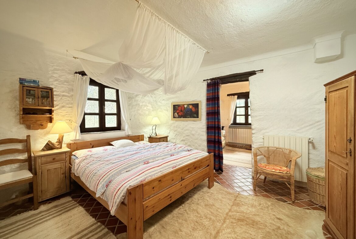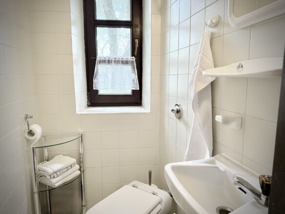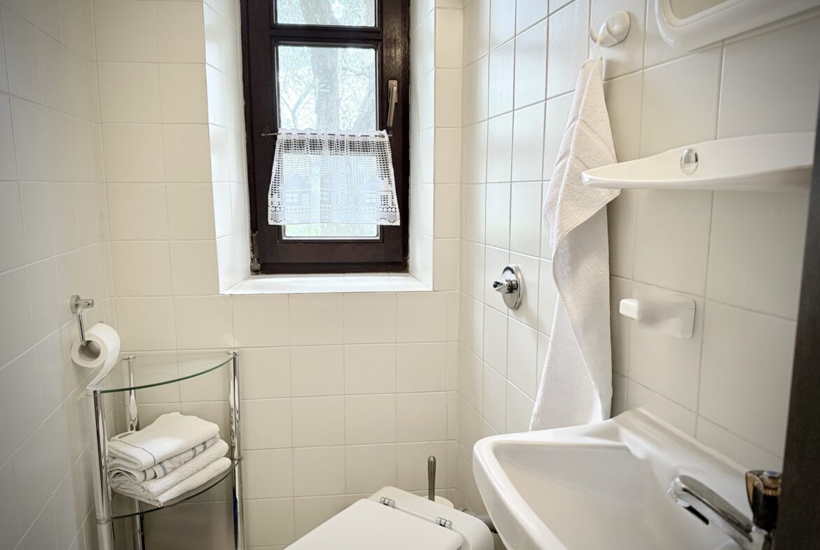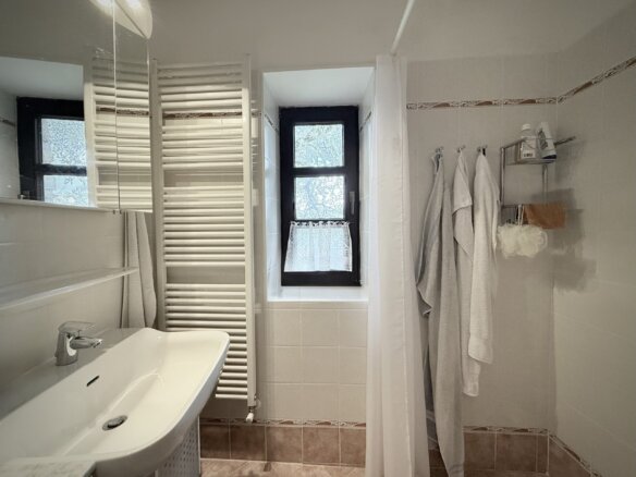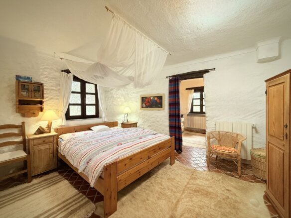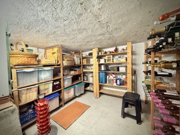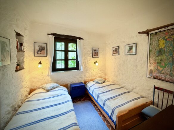 Split over 3 floor levels the house offers 110 qm living space with 2 terraces measuring 10 qm each and some 65 qm cellar space. It has a 58 qm garden with outside shower and BBQ. Due to its position on a sloping hillside, the cellar with work shop, laundry room, heating and wine cellar can be accessed from the south facing side. The ground floor main entrance is accessible from the garden and offers a hall, the master bedroom with adjacent office/guest room, one further bedroom with fireplace, a dining area accommodating 8 people and a kitchen. Two terraces (facing south/east and north/west) offer the choice between sitting in the shade or in the sun.