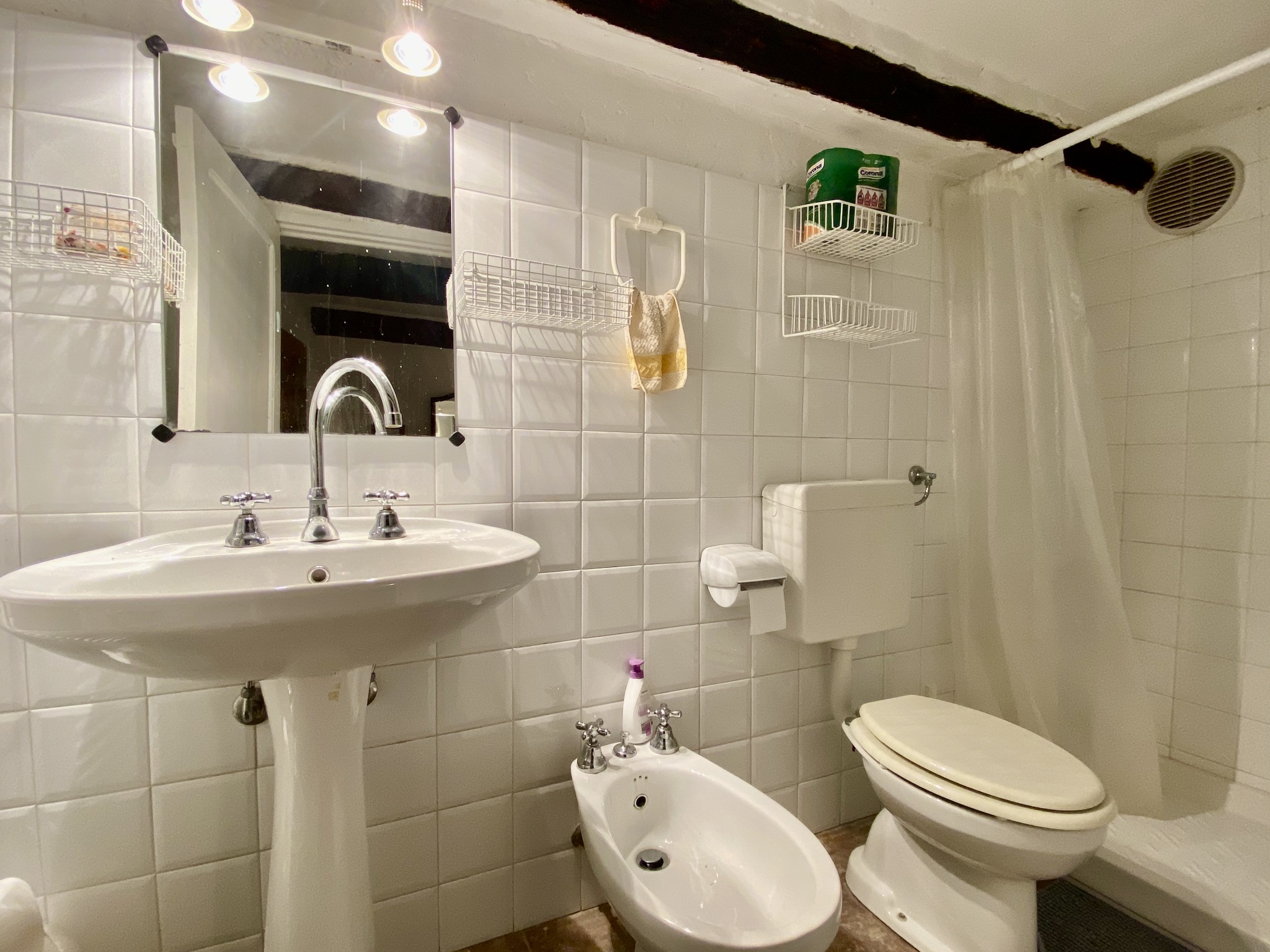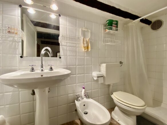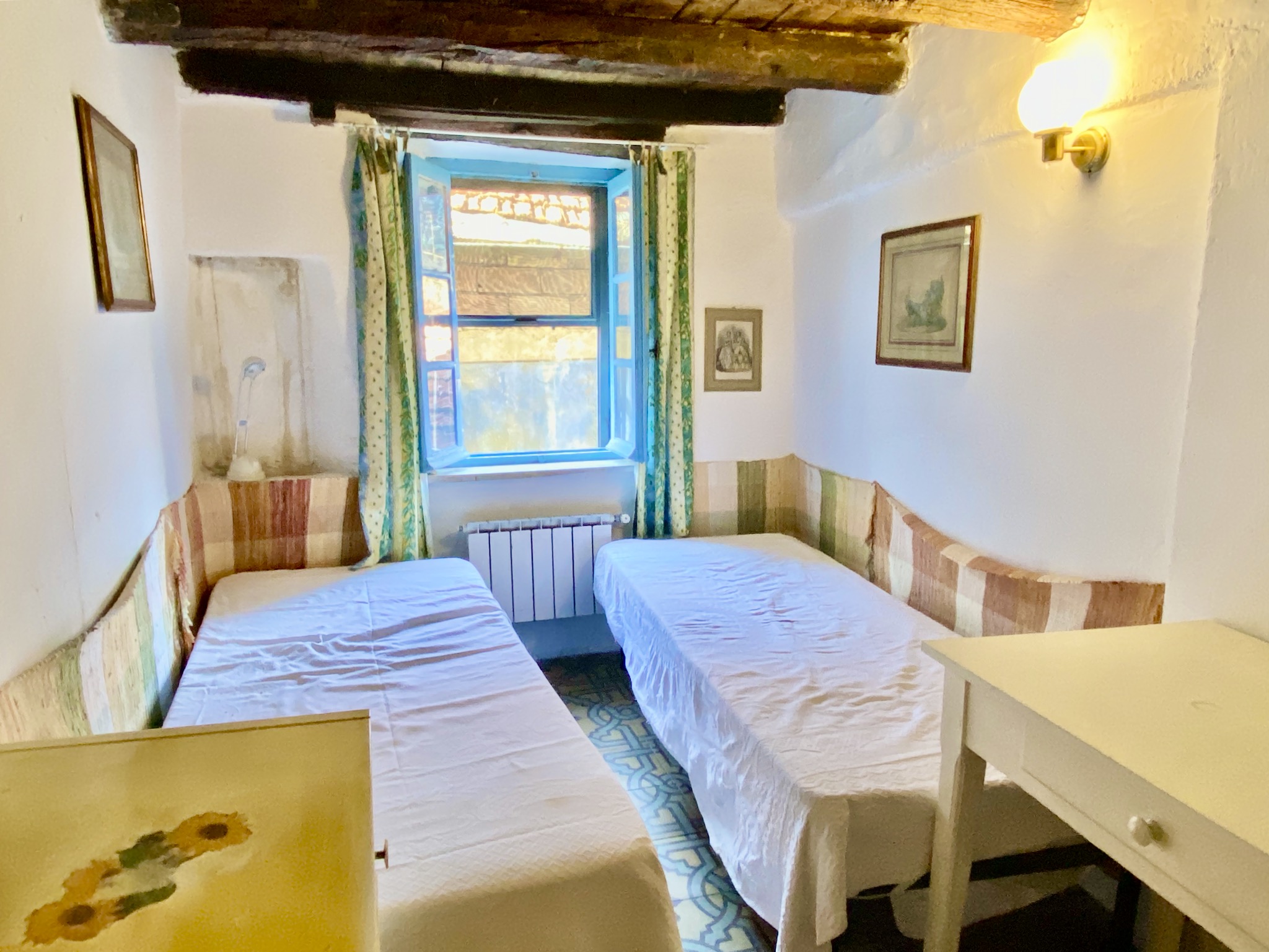 The property for sale in Castel Vittorio has been lovingly renovated in 1998 in keeping with the traditional style. In parts, the genuinely old floor tiles and wooden ceiling beams are still in place. A gas central heating and a wood fired oven in the living room keep the town house for sale in Castel Vittorio comfortably warm during the colder months of the year.