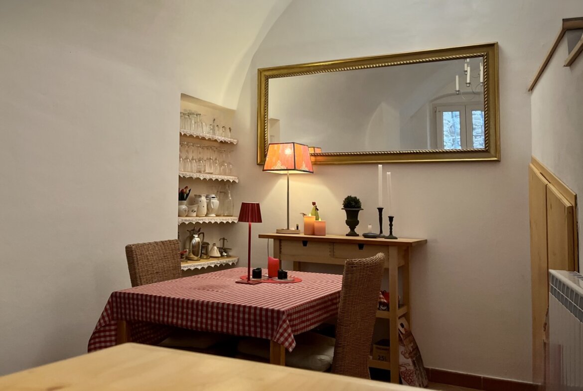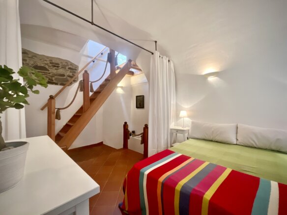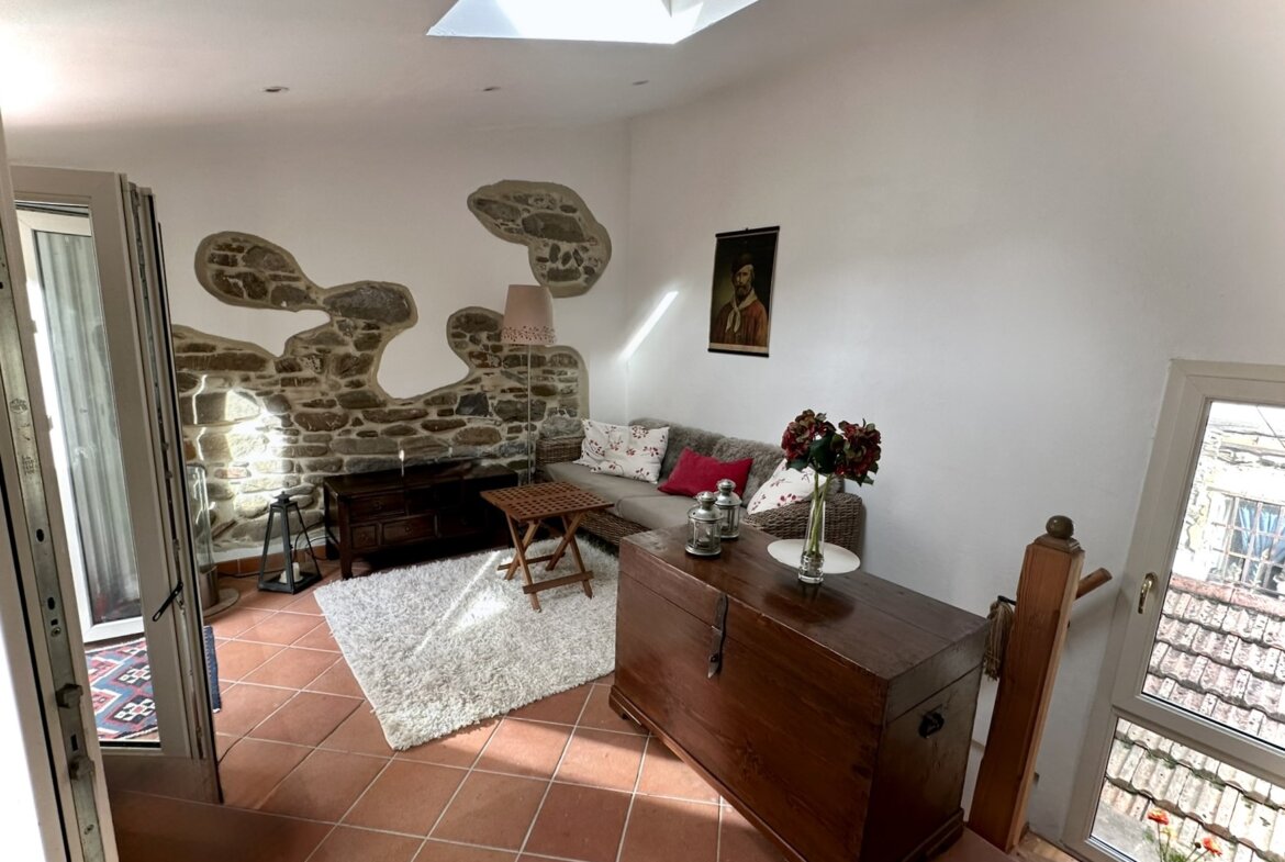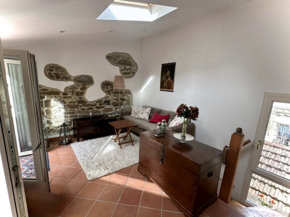 The bedroom with two large windows is located on the second floor and flooded with light. The vaulted ceilings give the room a particular charm. A small living room is located on the attic floor with access to the romantic terrace (approx. 6m2) – the perfect place to enjoy a chilled glass of wine on a balmy evening. The house was completely renovated in 2007 and fitted with new insulated wooden windows and shutters as well as a gas central heating system. There is also the option to heat the bathroom with a pellet fired stove.
